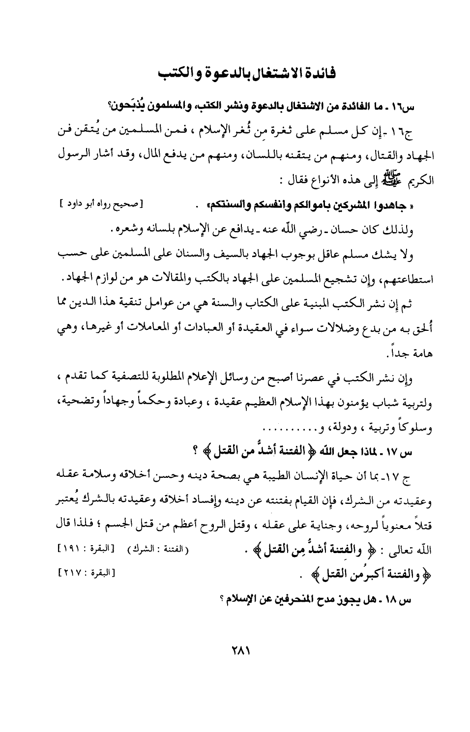 ج 16 - إِن كل مسلم على ثغرة مِن ثُغر الإِسلام، فمن المسلمين من يُتقن فن الجهاد والقتال، ومنهم من يتقنه باللسان، ومنهم من يدفع المال، وقد أشار الرسول الكريم - صلى الله عليه وسلم - إلى هذه الأنواع فقال: