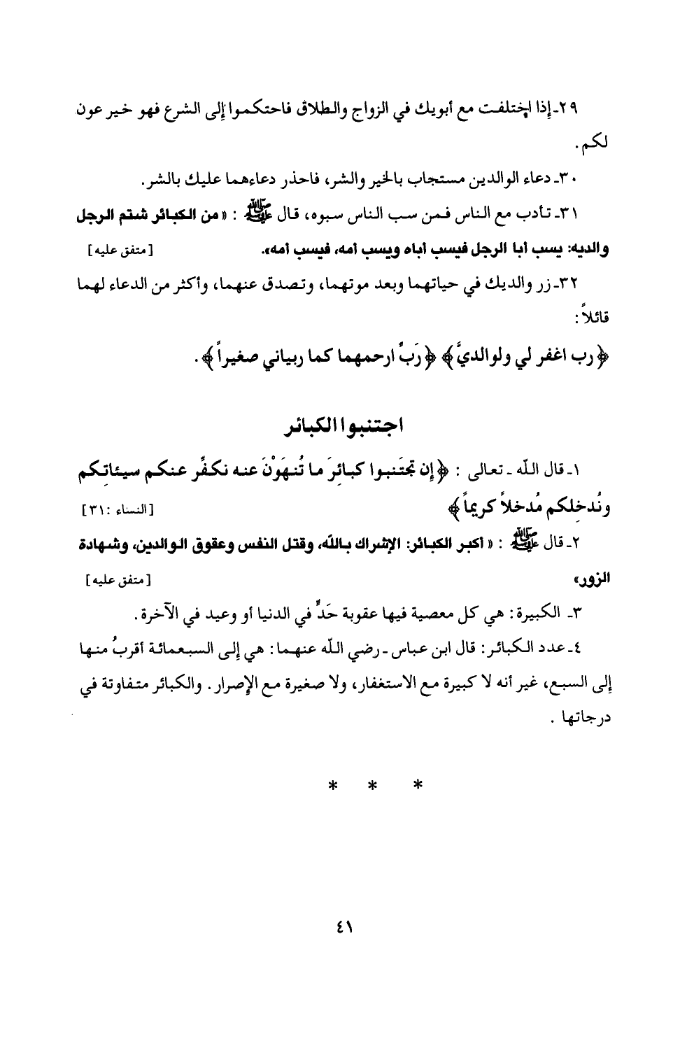 32 - زر والديك في حياتهما وبعد موتهما، وتصدق عنهما، وأكثر من الدعاء لهما قائلا: {رَبِّ اغْفِرْ لِي وَلِوَالِدَيَّ} {رَبِّ ارْحَمْهُمَا كَمَا رَبَّيَانِي صَغِيرًا}.