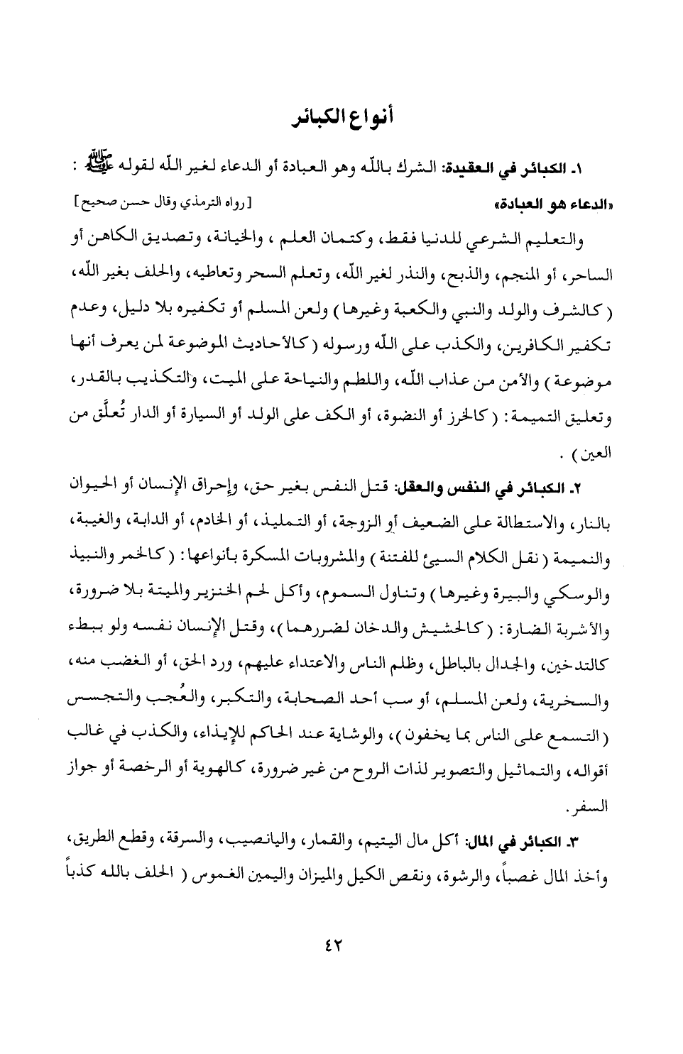 1 - الكبائر في العقيدة: الشرك بالله وهو العبادة أو الدعاء لغير الله لقوله - صلى الله عليه وسلم -: "الدعاء هو العبادة" [رواه الترمذي وقال حسن صحيح]