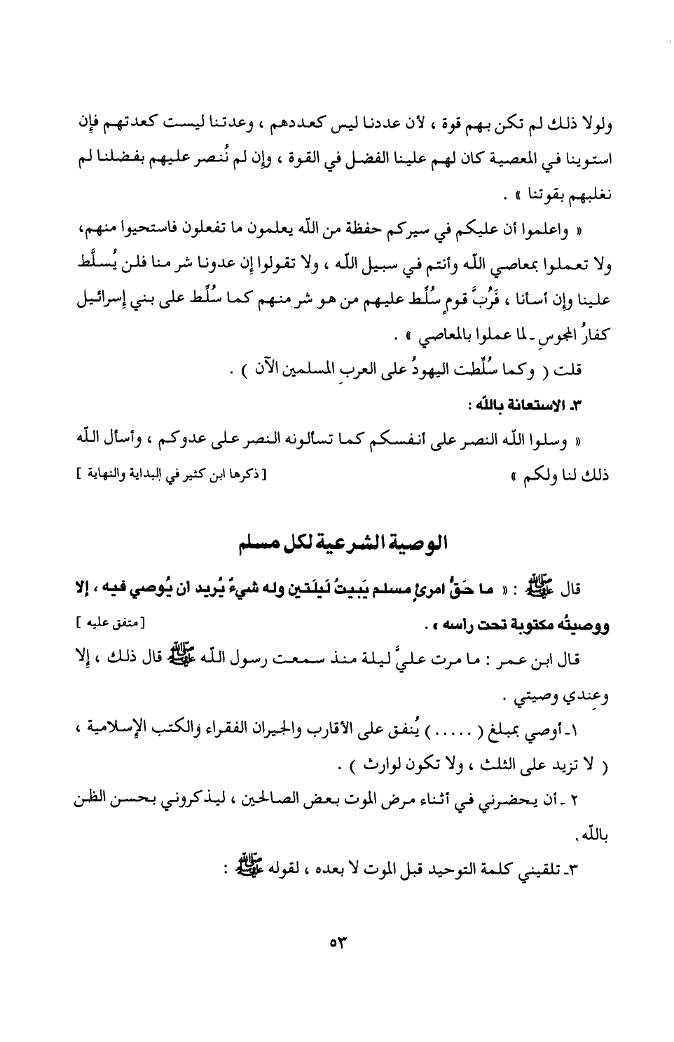 "واعلموا أن عليكم في سيركم حفظة من الله يعلمون ما تفعلون فاستحيوا منهم، ولا تعملوا بمعاصي الله وأنتم في سبيل الله، ولا تقولوا إِن عدونا شر منا فلن يُسلَّط علينا وإن أسأنا، فَرُبَّ قومٍ سُلِّط عليهم من هو شر منهم كما سلِّط على بني إِسرائيل كفارُ المجوسِ - لما عملوا بالمعاصي".