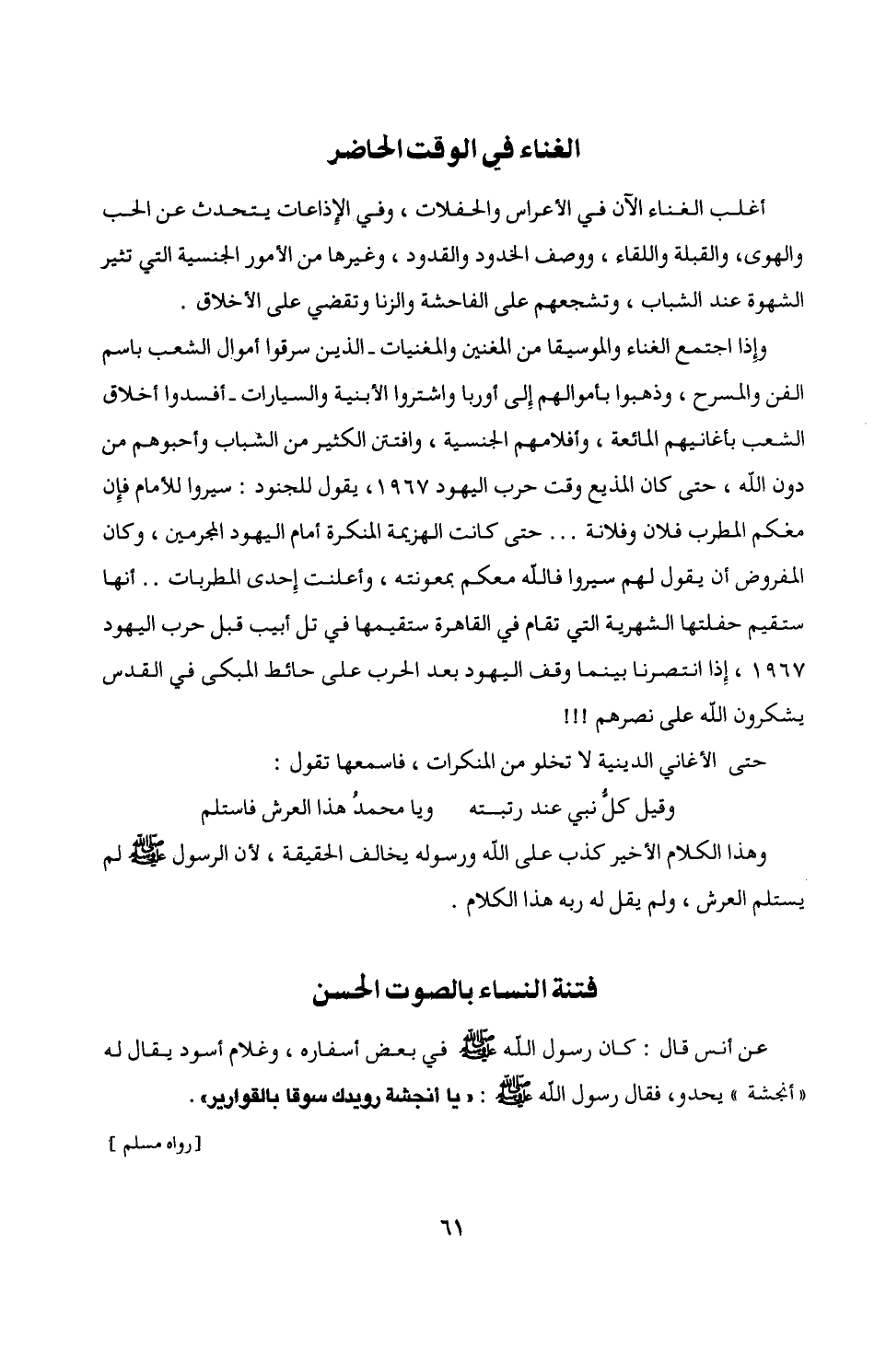 وإذا اجتمع الغناء والموسيقا من المغنين والمغنيات - الذين سرقوا أموال الشعب باسم الفن والمسرح، وذهبوا بأموالهم إِلى أوربا واشتروا الأبنية والسيارات - أفسدوا أخلاق الشعب بأغانيهم المائعة، وأفلامهم الجنسية، وافتتن الكثير من الشباب وأحبوهم من دون الله، حتى كان المذيع وقت حرب اليهود 1967، يقول للجنود: سيروا للأمام فإِن معكم المطرب فلان وفلانة ... حتى كانت الهزيمة المنكرة أمام اليهود المجرمين، وكان المفروض أن يقول لهم سيروا فالله معكم بمعونته، وأعلنت إحدى المطربات .. أنها ستقيم حفلتها الشهرية التي تقام في القاهرة ستقيمها في تل أبيب قبل حرب اليهود 1967، إِذا انتصرنا بينما وقف اليهود بعد الحرب على حائط المبكى في القدس يشكرون الله على نصرهم!!!