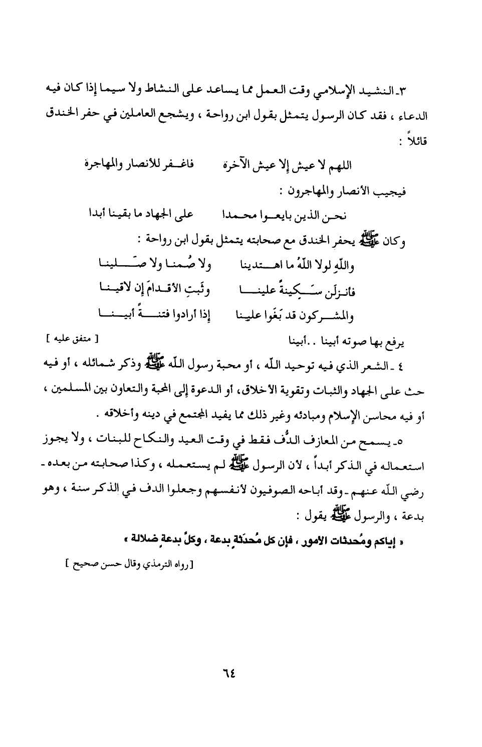 3 - النشيد الإِسلامي وقت العمل مما يساعد على النشاط ولا سيما إِذا كان فيه الدعاء، فقد كان الرسول يتمثل يقول ابن رواحة، ويشجع العاملين في حفر الخندق قائلًا: