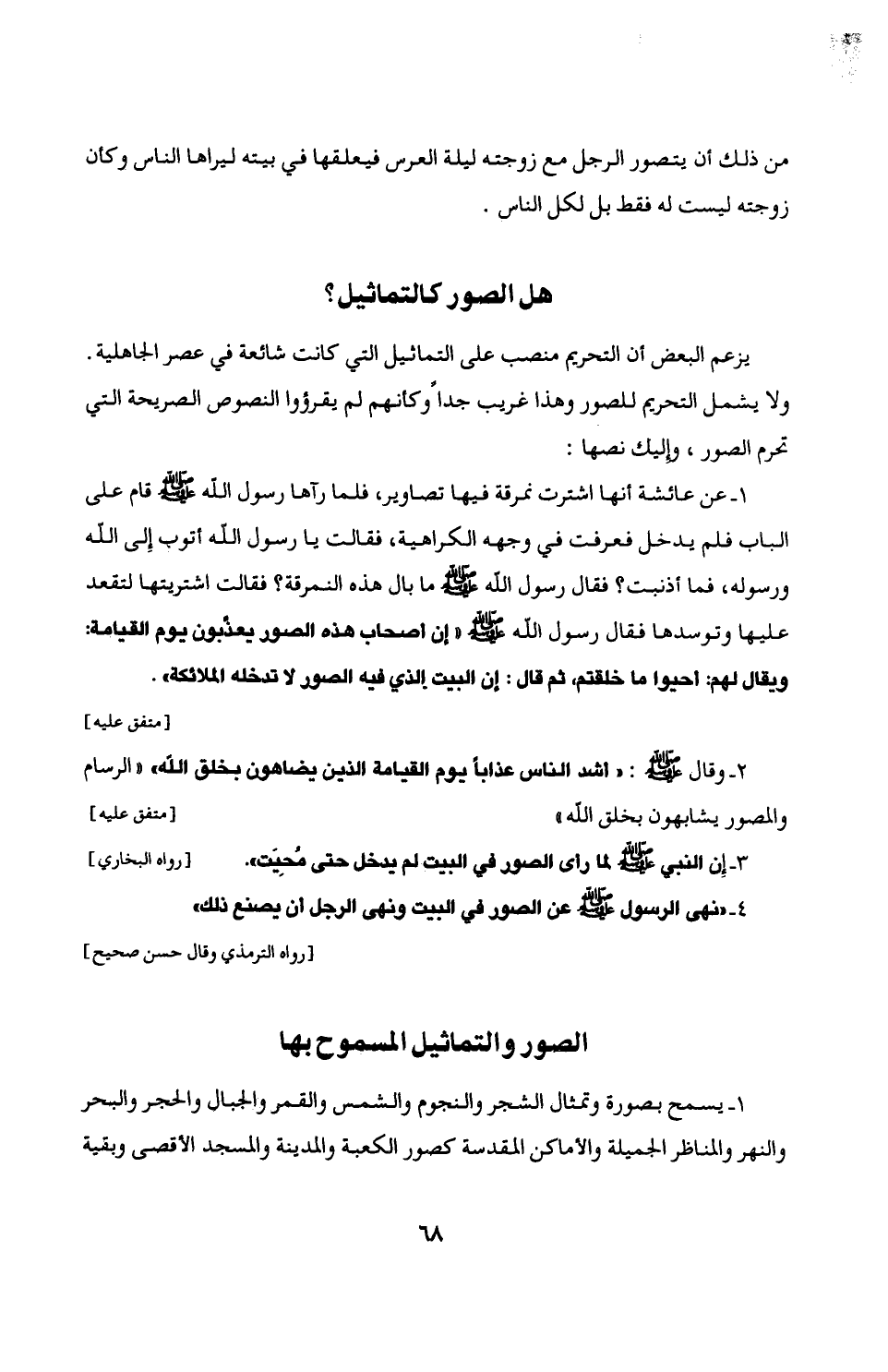 1 - عن عائشة أنها اشترت نمرقة فيها تصاوير، فلما رآها رسول الله - صلى الله عليه وسلم - قام على الباب فدم يدخل فعرفت في وجهه الكراهية، فقالت يا رسول الله أتوب إِلى الله ورسوله، فما أذنبت؟ فقال رسول الله - صلى الله عليه وسلم - ما بال هذه النمرقة؟ فقالت اشتريتها لتقعد عليها وتوسدها فقال رسول الله - صلى الله عليه وسلم - "إن أصحاب هذه الصور يعذبون يوم القيامة: ويقال لهم: أحيوا ما خلقتم، ثم قال: إن البيت الذي فيه الصور لا تدخله الملائكة". [متفق عليه]