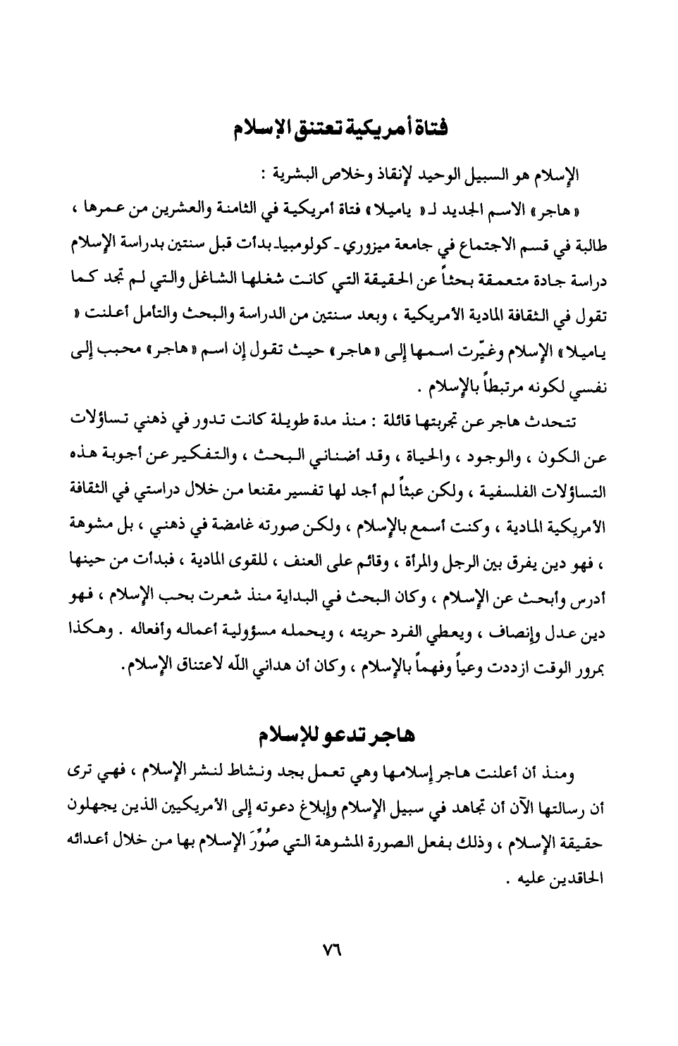 "هاجر" الاسم الجديد لـ "ياميلا" فتاة أمريكية في الثامنة والعشرين من عمرها، طالبة في قسم الاجتماع في جامعة ميزورى -كولومبيا- بدأت قبل سنتين بدراسة الإسلام دراسة جادة متعمقة بحثًا عن الحقيقة التي كانت شغلها الشاغل والتي لم تجد كما تقول في الثقافة المادية الأمريكية، وبعد سنتين من الدراسة والبحث والتأمل أعلنت" ياميلا" الإسلام وغيَّرت اسمها إِلى "هاجر" حيث تقول إِن اسم (هاجر) محبب إِلى نفسي لكونه مرتبطاً بالإسلام.