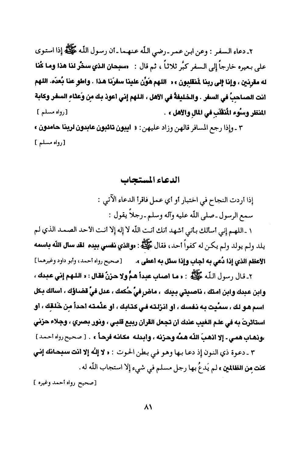 2 - دعاء السفر: وعن ابن عمر -رضي الله عنهما- أن رسول الله - صلى الله عليه وسلم - إِذا استوى على بعيره خارجاً إلى السفر كبَّر ثلاثًا، ثم قال: "سبحان الذي سخر لنا هذا وما كُنا له مقرنين، وإنا إلى ربنا لمنقلبون" "اللهم هوِّن علينا سفرنا هذا. واطو عنا بُعدَه. اللهم أنت الصاحِبُ في السفر, والخليفةُ في الأهل، اللهم إني أعوذ بك من وَعثاءِ السفر وكآبة المنظر وسُوء المنقلب في المالِ والأهل". [رواه مسلم]