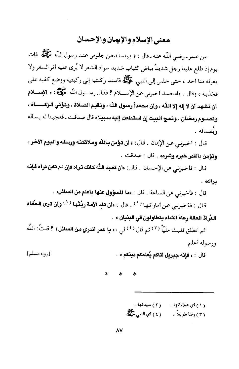 عن عمر -رضي الله عنه- قال: "بينما نحن جلوس عند رسول الله - صلى الله عليه وسلم - ذات يوم إذ طلع علينا رجل شديدٌ بياض الثياب شديد سواد الشعر لا يُرى عليه أثر السفر ولا يعرفه منا أحد، حتى جلس إِلى النبي - صلى الله عليه وسلم - فأسند ركبتيه إِلى ركبتيه ووضع كفيه على فخذيه، وقال. يا محمد أخبرني عن الإِسلام؟ فقال رسول الله - صلى الله عليه وسلم -: "الإسلام أن تشهد أن لا إله إلا الله، وأن محمدًا رسول الله، وتقيم الصلاة، وتؤتي الزكاة، وتصوم رمضان، وتحج البيت إن استطعت إليه سبيلا" قال صدقت - فعجبنا له يسأله ويُصدقه.