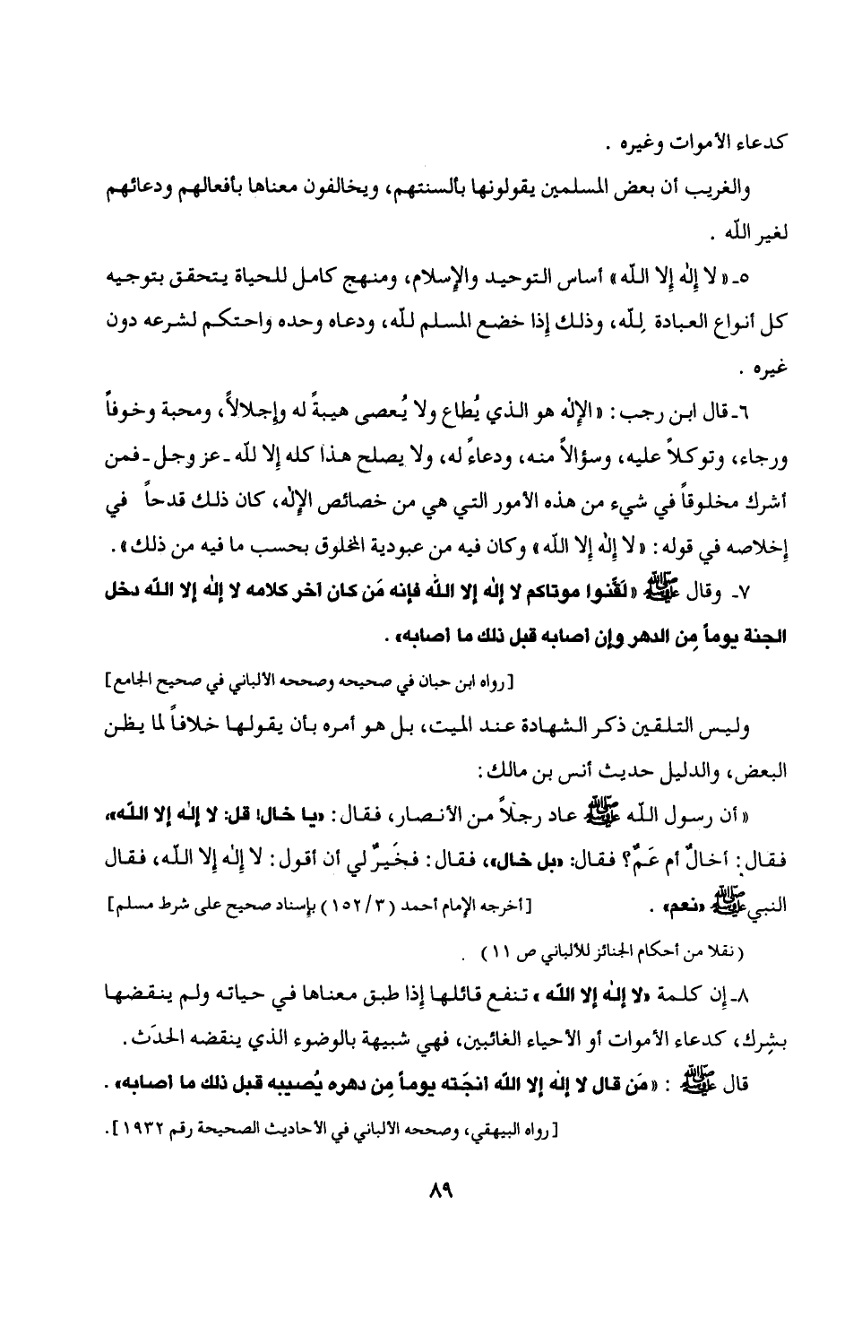 8 - إِن كلمة "لا إله إلا الله، تنفع قائلها إِذا طبق معناها في حياته ولم ينقضها بشِرك، كدعاء الأموات أو الأحياء الغائبين، فهي شبيهة بالوضوء الذي ينقضه الحدَث.