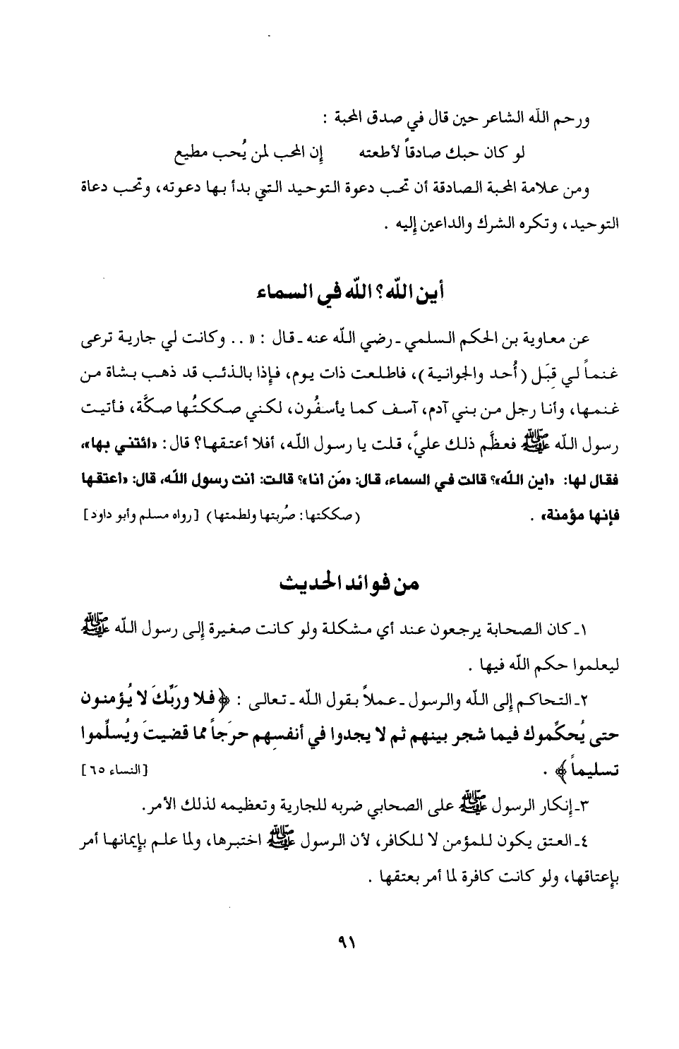 2 - التحاكم إِلى الله والرسول- عملًا يقول الله - تعالى: {فَلَا وَرَبِّكَ لَا يُؤْمِنُونَ حَتَّى يُحَكِّمُوكَ فِيمَا شَجَرَ بَيْنَهُمْ ثُمَّ لَا يَجِدُوا فِي أَنْفُسِهِمْ حَرَجًا مِمَّا قَضَيْتَ وَيُسَلِّمُوا تَسْلِيمًا}. [النساء: 65]