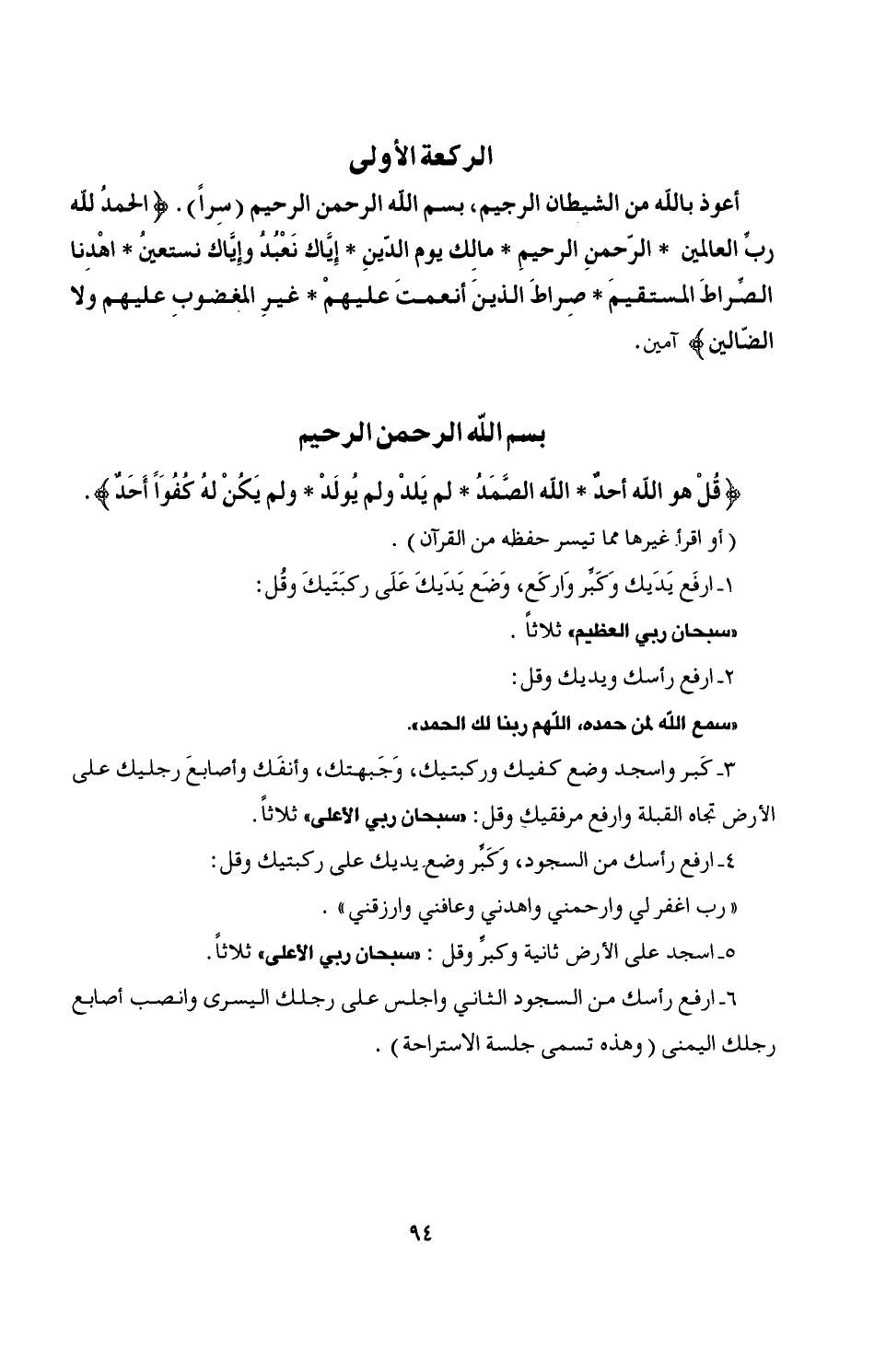 3 - كَبر واسجد وضع كفيك وركبتيك، وَجَبهتك، وأنفَك وأصابعَ رجليك على الأرض تجاه القبلة وارفع مرفقيك وقل: "سبحان ربي الأعلى" ثلاثًا.