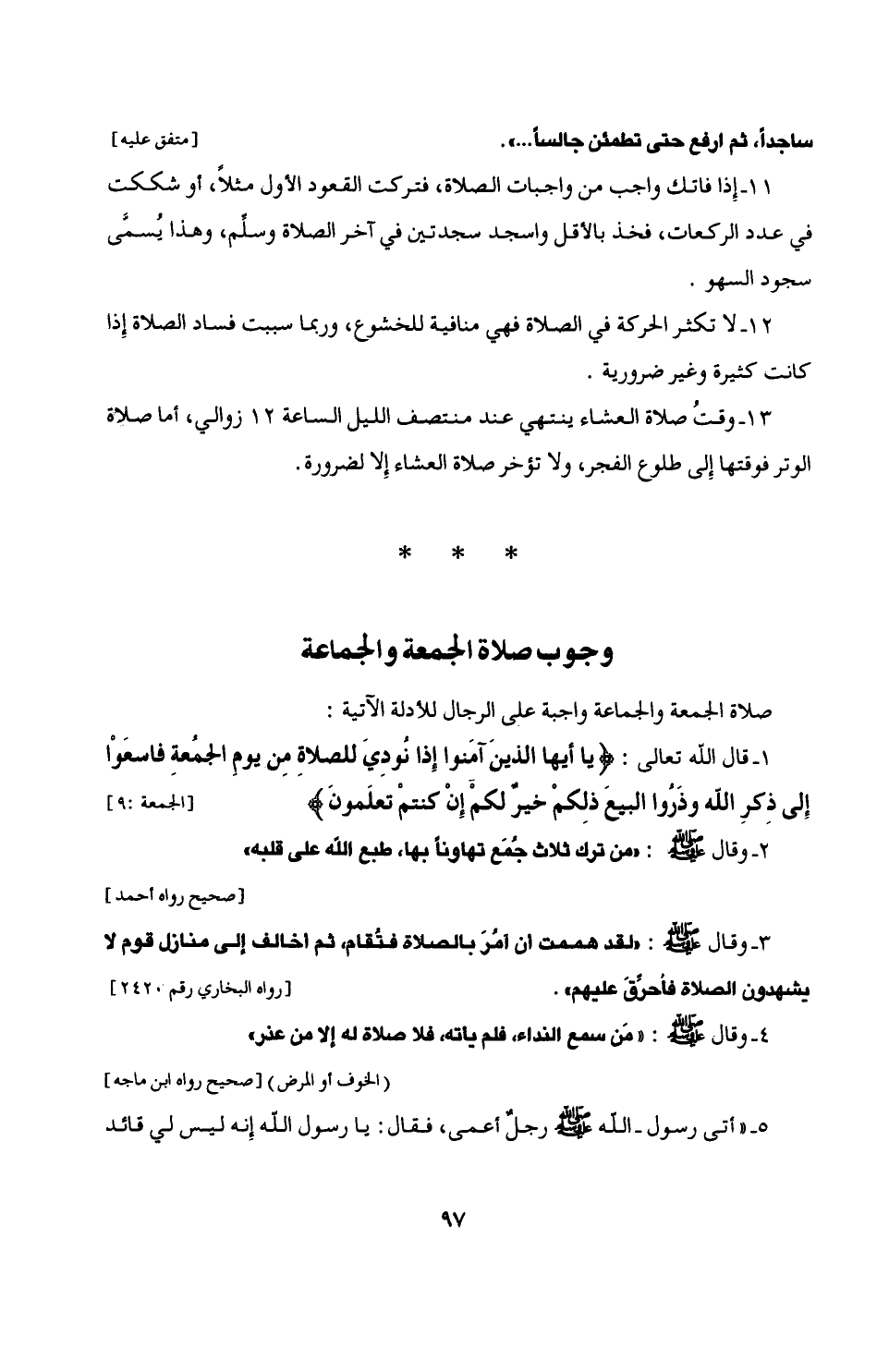 4 - وقال - صلى الله عليه وسلم -: "مَن سمع النداء، فلم يأته، فلا صلاة له إلا من عذر" (الخوف أو المرض) [صحيح رواه ابن ماجه]