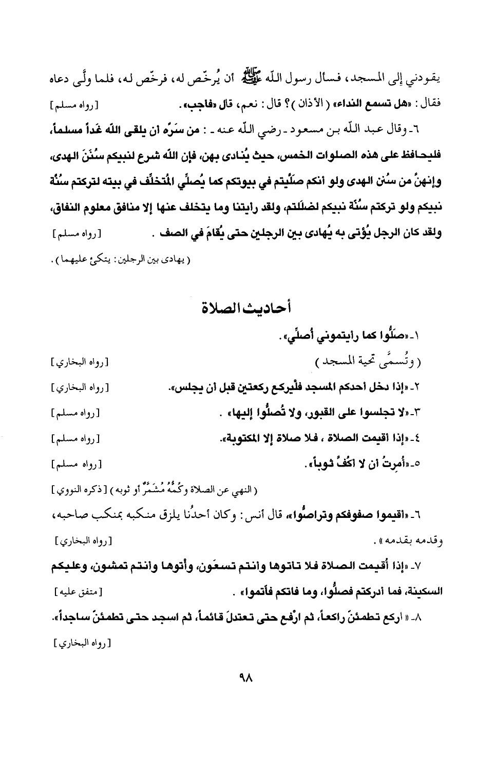8 - "اركع تطمئنّ راكعاً، كم ارْفع حتى تعتدلَ قائمًا، كم اسجد حتى تطمئنّ ساجداً". [رواه البخاري]