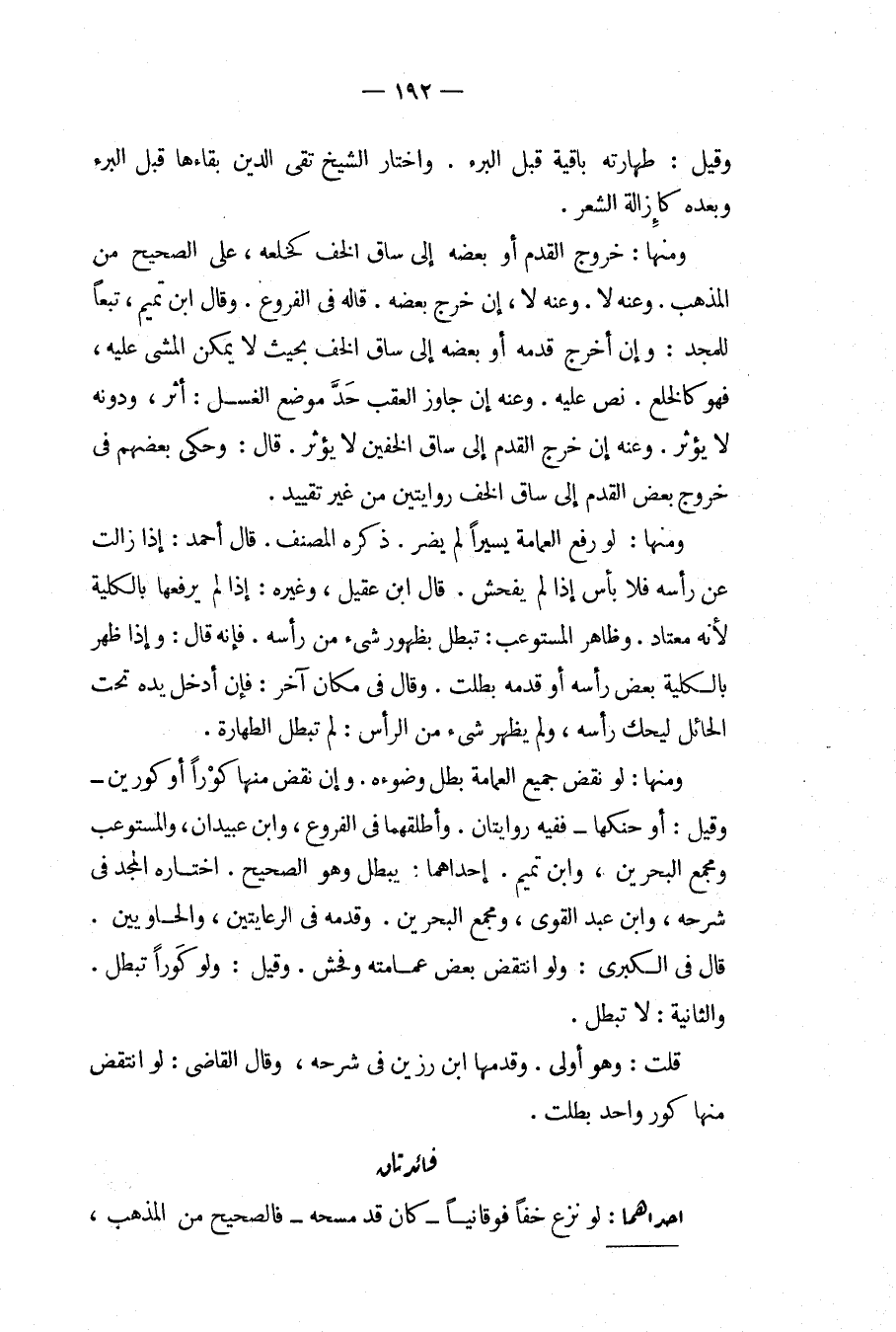 وَقِيلَ: طَهَارَتُهُ بَاقِيَةٌ قَبْلَ الْبُرْءِ. وَاخْتَارَ الشَّيْخُ تَقِيُّ الدِّينِ بَقَاءَهَا قَبْلَ الْبُرْءِ وَبَعْدَهُ كَإِزَالَةِ الشَّعْرِ. وَمِنْهَا: خُرُوجُ الْقَدَمِ أَوْ بَعْضِهِ إلَى سَاقِ الْخُفِّ كَخَلْعِهِ، عَلَى الصَّحِيحِ مِنْ الْمَذْهَبِ. وَعَنْهُ لَا، إنْ خَرَجَ بَعْضُهُ. قَالَهُ فِي الْفُرُوعِ. وَقَالَ ابْنُ تَمِيمٍ، تَبَعًا لِلْمَجْدِ: وَإِنْ أَخْرَجَ قَدَمَهُ أَوْ بَعْضَهُ إلَى سَاقِ الْخُفِّ بِحَيْثُ لَا يُمْكِنُ الْمَشْيُ عَلَيْهِ، فَهُوَ كَالْخَلْعِ، نَصَّ عَلَيْهِ. وَعَنْهُ إنْ جَاوَزَ الْعَقِبُ حَدَّ مَوْضِعِ الْغَسْلِ: أَثَّرَ، وَدُونَهُ لَا يُؤَثِّرُ. وَعَنْهُ إنْ خَرَجَ الْقَدَمُ إلَى سَاقِ الْخُفَّيْنِ لَا يُؤَثِّرُ. قَالَ: وَحَكَى بَعْضُهُمْ فِي خُرُوجِ بَعْضِ الْقَدَمِ إلَى سَاقِ الْخُفِّ رِوَايَتَيْنِ مِنْ غَيْرِ تَقْيِيدٍ. وَمِنْهَا: لَوْ رَفَعَ الْعِمَامَةَ يَسِيرًا لَمْ يَضُرَّ. ذَكَرَهُ الْمُصَنِّفُ. قَالَ أَحْمَدُ: إذَا زَالَتْ عَنْ رَأْسِهِ فَلَا بَأْسَ إذَا لَمْ يَفْحُشْ. قَالَ ابْنُ عَقِيلٍ، وَغَيْرُهُ: إذَا لَمْ يَرْفَعْهَا بِالْكُلِّيَّةِ لِأَنَّهُ مُعْتَادٌ، وَظَاهِرُ الْمُسْتَوْعِبِ: تَبْطُلُ بِظُهُورِ شَيْءٍ مِنْ رَأْسِهِ. فَإِنَّهُ قَالَ: وَإِذَا ظَهَرَ بِالْكُلِّيَّةِ بَعْضُ رَأْسِهِ أَوْ قَدَمِهِ بَطَلَتْ. وَقَالَ فِي مَكَان آخَرَ: فَإِنْ أَدْخَلَ يَدَهُ تَحْتَ الْحَائِلِ لِيَحُكَّ رَأْسَهُ، وَلَمْ يَظْهَرْ شَيْءٌ مِنْ الرَّأْسِ: لَمْ تَبْطُلْ الطَّهَارَةُ. وَمِنْهَا: لَوْ نَقَضَ جَمِيعَ الْعِمَامَةِ بَطَلَ وُضُوءُهُ. وَإِنْ نَقَضَ مِنْهَا كَوْرًا أَوْ كَوْرَيْنِ وَقِيلَ: أَوْ حَنَّكَهَا فَفِيهِ رِوَايَتَانِ، وَأَطْلَقَهُمَا فِي الْفُرُوعِ، وَابْنُ عُبَيْدَانَ، وَالْمُسْتَوْعِبِ وَمَجْمَعِ الْبَحْرَيْنِ، وَابْنُ تَمِيمٍ. إحْدَاهُمَا: يَبْطُلُ وَهُوَ الصَّحِيحُ، اخْتَارَهُ الْمَجْدُ فِي شَرْحِهِ، وَابْنُ عَبْدِ الْقَوِيِّ، وَمَجْمَعِ الْبَحْرَيْنِ، وَقَدَّمَهُ فِي الرِّعَايَتَيْنِ، وَالْحَاوِيَيْنِ. قَالَ فِي الْكُبْرَى: وَلَوْ انْتَقَضَ بَعْضُ عِمَامَتِهِ وَفَحُشَ. وَقِيلَ: وَلَوْ كُورًا تَبْطُلُ. وَالثَّانِيَةُ: لَا تَبْطُلُ. قُلْت: وَهُوَ أَوْلَى. وَقَدَّمَهَا ابْنُ رَزِينٍ فِي شَرْحِهِ، وَقَالَ الْقَاضِي: لَوْ انْتَقَضَ مِنْهَا كُورٌ وَاحِدٌ بَطَلَتْ.
