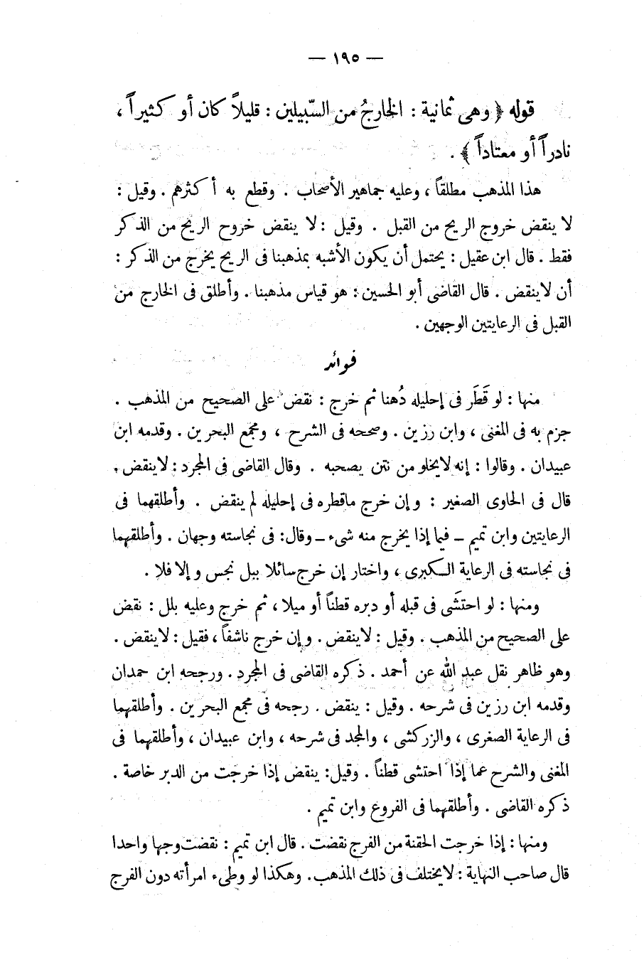 قَوْلُهُ {وَهِيَ ثَمَانِيَةٌ: الْخَارِجُ مِنْ السَّبِيلَيْنِ: قَلِيلًا كَانَ أَوْ كَثِيرًا، نَادِرًا أَوْ مُعْتَادًا} ، هَذَا الْمَذْهَبُ مُطْلَقًا، وَعَلَيْهِ جَمَاهِيرُ الْأَصْحَابِ، وَقَطَعَ بِهِ أَكْثَرُهُمْ. وَقِيلَ: لَا يَنْقُضُ خُرُوجُ الرِّيحِ مِنْ الْقُبُلِ. وَقِيلَ: لَا يَنْقُضُ خُرُوجُ الرِّيحِ مِنْ الذَّكَرِ فَقَطْ. قَالَ ابْنُ عَقِيلٍ: يَحْتَمِلُ أَنْ يَكُونَ الْأَشْبَهُ بِمَذْهَبِنَا فِي الرِّيحِ يَخْرُجُ مِنْ الذَّكَرِ: أَنْ لَا يَنْقُضَ. قَالَ الْقَاضِي أَبُو الْحُسَيْنِ: هُوَ قِيَاسُ مَذْهَبِنَا. وَأَطْلَقَ فِي الْخَارِجِ مِنْ الْقُبُلِ فِي الرِّعَايَتَيْنِ الْوَجْهَيْنِ.