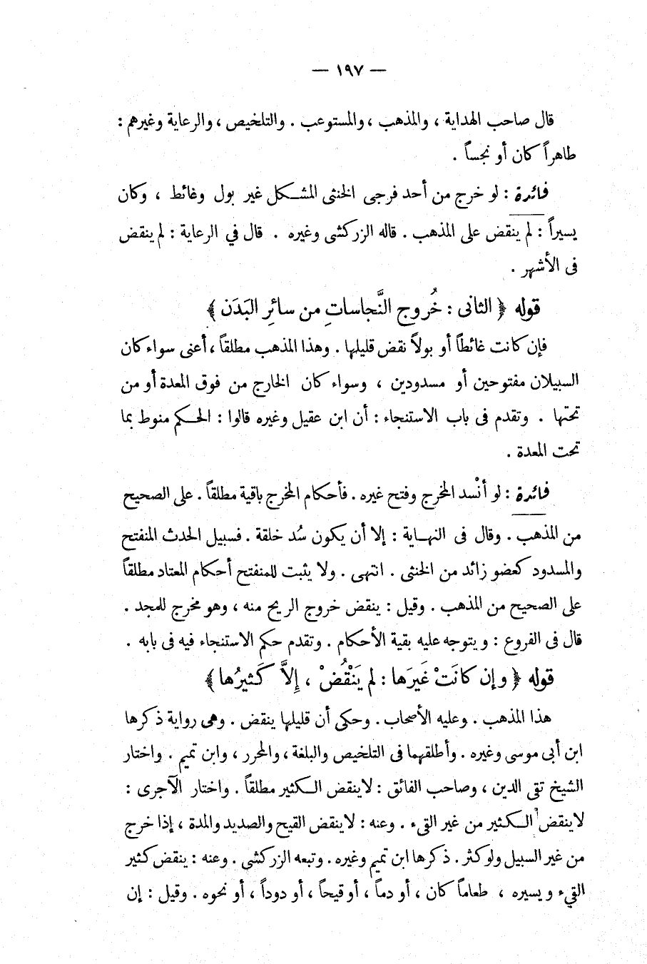 وَتَقَدَّمَ حُكْمُ الِاسْتِنْجَاءِ فِيهِ فِي بَابِهِ. قَوْلُهُ {وَإِنْ كَانَتْ غَيْرُهَا: لَمْ يَنْقُضْ، إلَّا كَثِيرًا} هَذَا الْمَذْهَبُ، وَعَلَيْهِ الْأَصْحَابُ. وَحَكَى أَنَّ قَلِيلَهَا يَنْقُضُ. وَهِيَ رِوَايَةٌ ذَكَرَهَا ابْنُ أَبِي مُوسَى وَغَيْرُهُ. وَأَطْلَقَهُمَا فِي التَّلْخِيصِ وَالْبُلْغَةِ، وَالْمُحَرَّرِ، وَابْنُ تَمِيمٍ، وَاخْتَارَ الشَّيْخُ تَقِيُّ الدِّينِ، وَصَاحِبُ الْفَائِقِ: لَا يَنْقُضُ الْكَثِيرُ مُطْلَقًا، وَاخْتَارَ الْآجُرِّيُّ: لَا يَنْقُضُ الْكَثِيرُ مِنْ غَيْرِ الْقَيْءِ. وَعَنْهُ: لَا يَنْقُضُ الْقَيْحُ وَالصَّدِيدُ وَالْمِدَّةُ، إذَا خَرَجَ مِنْ غَيْرِ السَّبِيلِ وَلَوْ كَثُرَ. ذَكَرَهَا ابْنُ تَمِيمٍ وَغَيْرُهُ. وَتَبِعَهُ الزَّرْكَشِيُّ. وَعَنْهُ: يَنْقُضُ كَثِيرُ الْقَيْءِ وَيَسِيرُهُ، طَعَامًا كَانَ، أَوْ دَمًا، أَوْ قَيْحًا، أَوْ دُودًا، أَوْ نَحْوَهُ. وَقِيلَ: إنْ