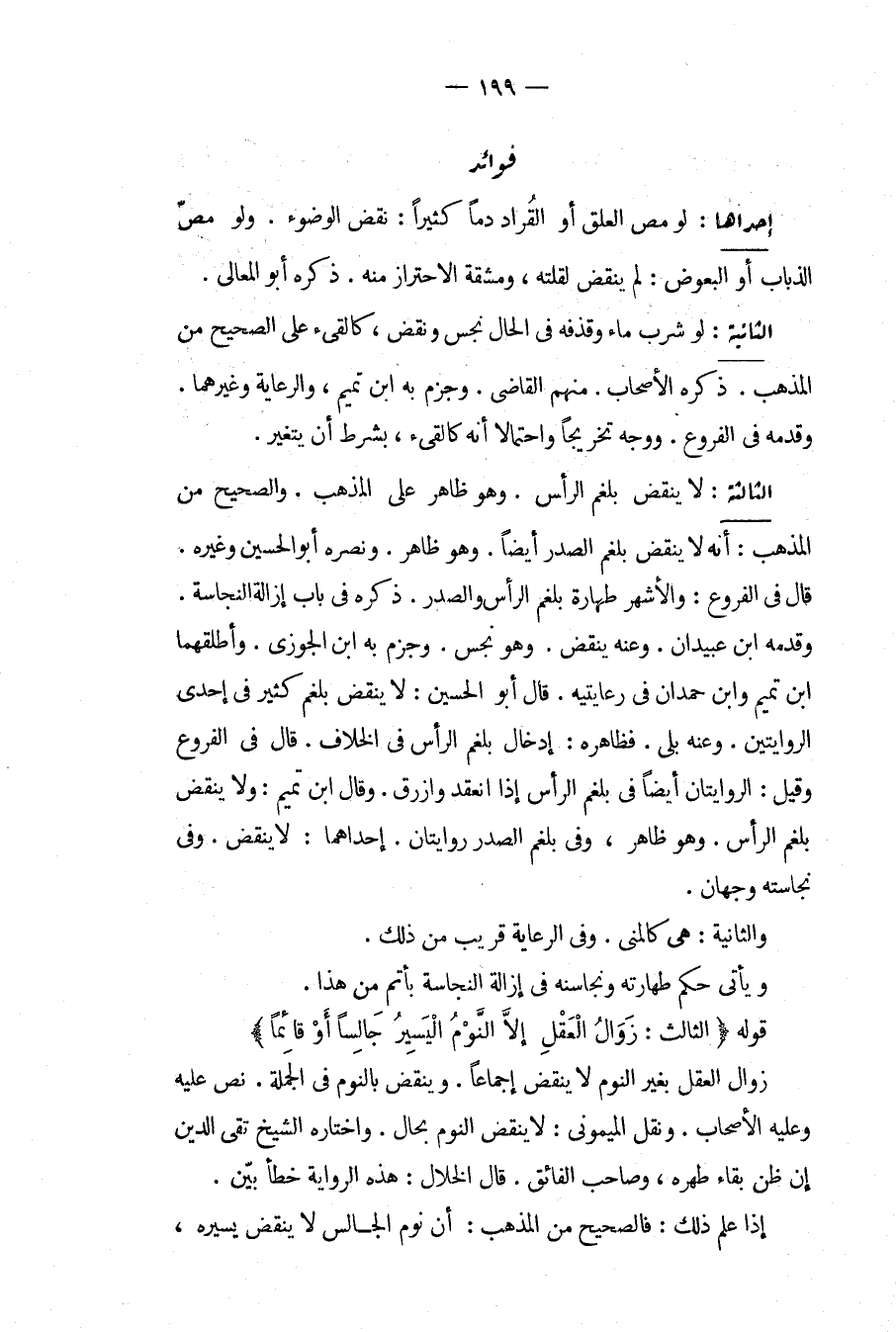 الثَّالِثَةُ: لَا يَنْقُضُ بَلْغَمُ الرَّأْسِ، وَهُوَ ظَاهِرٌ عَلَى الْمَذْهَبِ، وَالصَّحِيحُ مِنْ الْمَذْهَبِ: أَنَّهُ لَا يَنْقُضُ بَلْغَمُ الصَّدْرِ أَيْضًا. وَهُوَ ظَاهِرٌ، وَنَصَرَهُ أَبُو الْحُسَيْنِ وَغَيْرُهُ. قَالَ فِي الْفُرُوعِ: وَالْأَشْهَرُ طَهَارَةُ بَلْغَمِ الرَّأْسِ وَالصَّدْرِ ذَكَرَهُ فِي بَابِ إزَالَةِ النَّجَاسَةِ. وَقَدَّمَهُ ابْنُ عُبَيْدَانَ. وَعَنْهُ يَنْقُضُ، وَهُوَ نَجِسٌ وَجَزَمَ بِهِ ابْنُ الْجَوْزِيِّ. وَأَطْلَقَهُمَا ابْنُ تَمِيمٍ وَابْنُ حَمْدَانَ فِي رِعَايَتَيْهِ. قَالَ أَبُو الْحُسَيْنِ: لَا يَنْقُضُ بَلْغَمٌ كَثِيرٌ فِي إحْدَى الرِّوَايَتَيْنِ، وَعَنْهُ بَلَى. فَظَاهِرُهُ: إدْخَالُ بَلْغَمِ الرَّأْسِ فِي الْخِلَافِ. قَالَ فِي الْفُرُوعِ وَقِيلَ: الرِّوَايَتَانِ أَيْضًا فِي بَلْغَمِ الرَّأْسِ إذَا انْعَقَدَ وَازْرَقَّ. وَقَالَ ابْنُ تَمِيمٍ: وَلَا يَنْقُضُ بَلْغَمُ الرَّأْسِ، وَهُوَ ظَاهِرٌ، وَفِي بَلْغَمِ الصَّدْرِ رِوَايَتَانِ، إحْدَاهُمَا: لَا يَنْقُضُ. وَفِي نَجَاسَته وَجْهَانِ، وَالثَّانِيَةُ: هِيَ كَالْمَنِيِّ. وَفِي الرِّعَايَةِ قَرِيبٌ مِنْ ذَلِكَ. وَيَأْتِي حُكْمُ طَهَارَتِهِ وَنَجَاسَتِهِ فِي إزَالَةِ النَّجَاسَةِ بِأَتَمَّ مِنْ هَذَا.