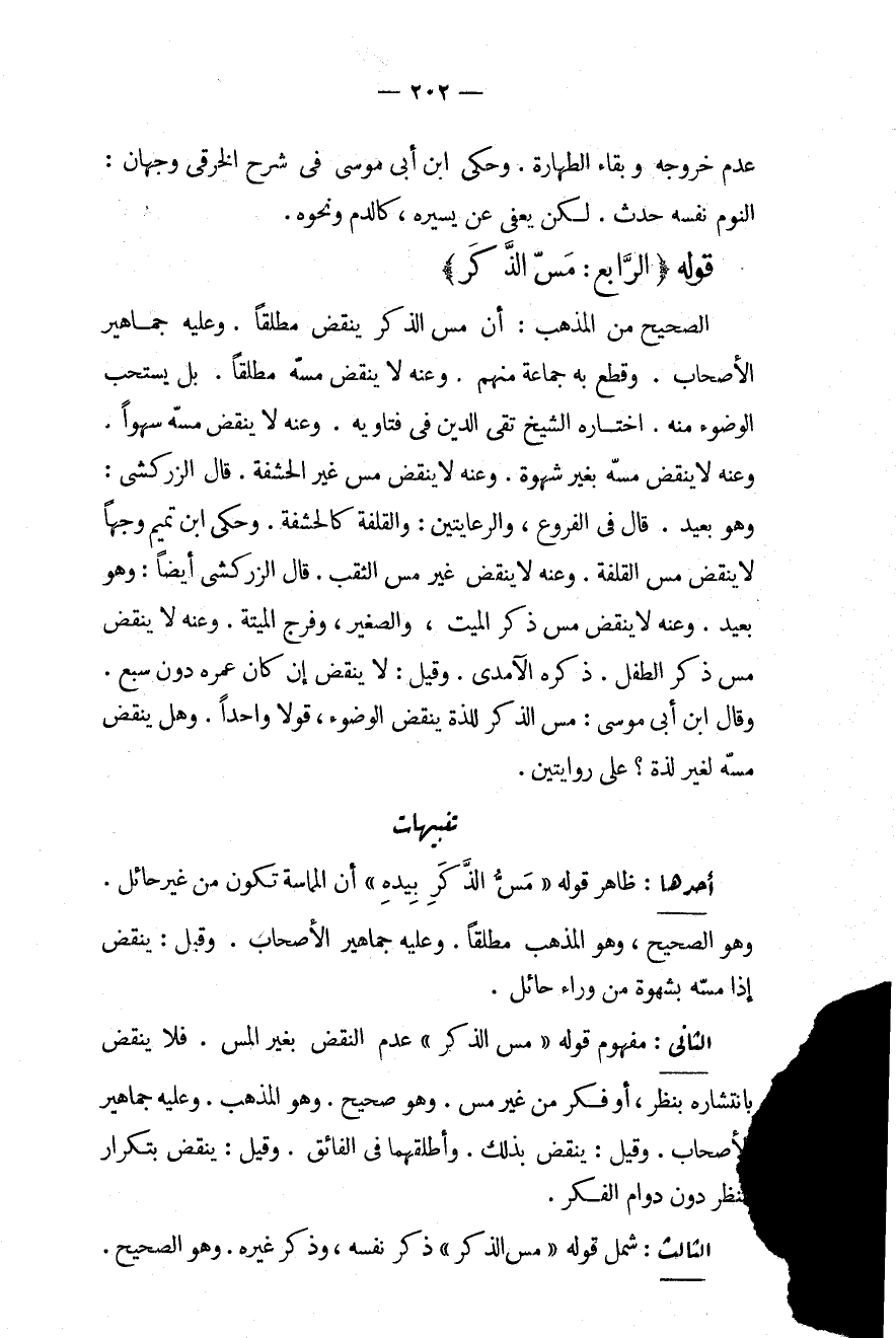 الثَّانِي: مَفْهُومُ قَوْلِهِ " مَسُّ الذَّكَرِ " عَدَمُ النَّقْضِ بِغَيْرِ الْمَسِّ. فَلَا يَنْقُضُ بِانْتِشَارِهِ بِنَظَرٍ، أَوْ فِكْرٍ مِنْ غَيْرِ مَسٍّ، وَهُوَ صَحِيحٌ، وَهُوَ الْمَذْهَبُ، وَعَلَيْهِ جَمَاهِيرُ الْأَصْحَابِ. وَقِيلَ: يَنْقُضُ بِذَلِكَ. وَأَطْلَقَهُمَا فِي الْفَائِقِ. وَقِيلَ: يَنْقُضُ بِتَكْرَارِ النَّظَرِ دُونَ دَوَامِ الْفِكْرِ. الثَّالِثُ: شَمِلَ قَوْلُهُ " مَسُّ الذَّكَرِ " ذَكَرَ نَفْسِهِ، وَذَكَرَ غَيْرِهِ، وَهُوَ الصَّحِيحُ.