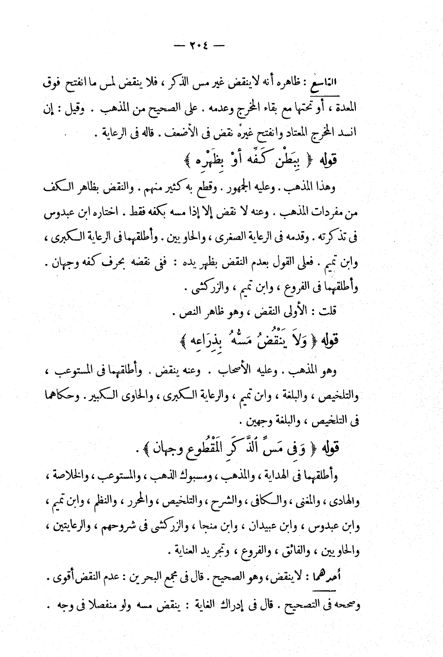 قَوْلُهُ {بِبَطْنِ كَفِّهِ أَوْ بِظَهْرِهِ} وَهَذَا الْمَذْهَبُ. وَعَلَيْهِ الْجُمْهُورُ وَقَطَعَ بِهِ كَثِيرٌ مِنْهُمْ. وَالنَّقْضُ بِظَاهِرِ الْكَفِّ مِنْ مُفْرَدَاتِ الْمُذْهَبِ. وَعَنْهُ لَا نَقْضَ إلَّا إذَا مَسَّهُ بِكَفِّهِ فَقَطْ، اخْتَارَهُ ابْنُ عَبْدُوسٍ فِي تَذْكِرَتِهِ. وَقَدَّمَهُ فِي الرِّعَايَةِ الصُّغْرَى، وَالْحَاوِيَيْنِ. وَأَطْلَقَهُمَا فِي الرِّعَايَةِ الْكُبْرَى، وَابْنُ تَمِيمٍ. فَعَلَى الْقَوْلِ بِعَدَمِ النَّقْضِ بِظَهْرِ يَدِهِ: فَفِي نَقْضِهِ بِحَرْفِ كَفِّهِ وَجْهَانِ، وَأَطْلَقَهُمَا فِي الْفُرُوعِ، وَابْنُ تَمِيمٍ. وَالزَّرْكَشِيُّ. قُلْت: الْأَوْلَى النَّقْضُ، وَهُوَ ظَاهِرُ النَّصِّ، قَوْلُهُ {وَلَا يَنْقُضُ مَسُّهُ بِذِرَاعِهِ} وَهُوَ الْمَذْهَبُ. وَعَلَيْهِ الْأَصْحَابُ. وَعَنْهُ يَنْقُضُ. وَأَطْلَقَهُمَا فِي الْمُسْتَوْعِبِ، وَالتَّلْخِيصِ، وَالْبُلْغَةِ، وَابْنُ تَمِيمٍ، وَالرِّعَايَةِ الْكُبْرَى، وَالْحَاوِي الْكَبِيرِ. وَحَكَاهُمَا فِي التَّلْخِيصِ، وَالْبُلْغَةِ وَجْهَيْنِ.