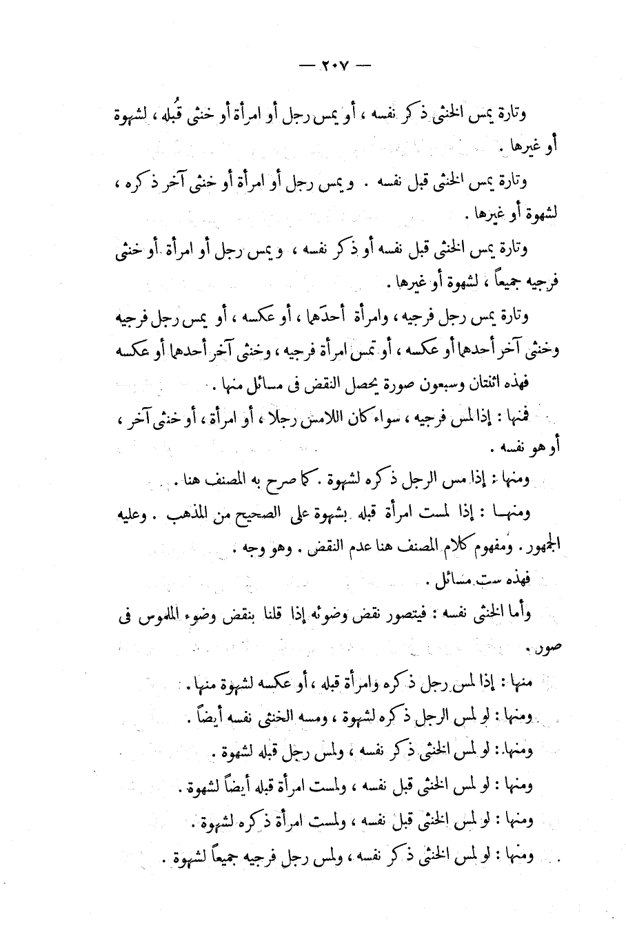وَتَارَةً يَمَسُّ الْخُنْثَى ذَكَرَ نَفْسِهِ، أَوْ يَمَسُّ رَجُلٌ أَوْ امْرَأَةٌ أَوْ خُنْثَى قُبُلَهُ، لِشَهْوَةٍ أَوْ غَيْرِهَا. وَتَارَةً يَمَسُّ الْخُنْثَى قُبُلَ نَفْسِهِ. وَيَمَسُّ رَجُلٌ أَوْ امْرَأَةٌ أَوْ خُنْثَى آخَرُ ذَكَرَهُ، لِشَهْوَةٍ أَوْ غَيْرِهَا. وَتَارَةً يَمَسُّ الْخُنْثَى قُبُلَ نَفْسِهِ أَوْ ذَكَرَ نَفْسِهِ، وَيَمَسُّ رَجُلٌ أَوْ امْرَأَةٌ أَوْ خُنْثَى فَرْجَيْهِ جَمِيعًا، لِشَهْوَةٍ أَوْ غَيْرِهَا. وَتَارَةً يَمَسُّ رَجُلٌ فَرْجَيْهِ، وَامْرَأَةٌ أَحَدَهُمَا، أَوْ عَكْسَهُ، أَوْ يَمَسُّ رَجُلٌ فَرْجَيْهِ وَخُنْثَى آخَرُ أَحَدَهُمَا أَوْ عَكْسَهُ، أَوْ تَمَسُّ امْرَأَةٌ فَرْجَيْهِ، وَخُنْثَى آخَرُ أَحَدَهُمَا أَوْ عَكْسَهُ فَهَذِهِ اثْنَتَانِ وَسَبْعُونَ صُورَةً يَحْصُلُ النَّقْضُ فِي مَسَائِلَ مِنْهَا. فَمِنْهَا: إذَا لَمَسَ فَرْجَيْهِ، سَوَاءٌ كَانَ اللَّامِسُ رَجُلًا، أَوْ امْرَأَةً، أَوْ خُنْثَى آخَرَ، أَوْ هُوَ نَفْسُهُ. وَمِنْهَا: إذَا مَسَّ الرَّجُلُ ذَكَرَهُ لِشَهْوَةٍ. كَمَا صَرَّحَ بِهِ الْمُصَنِّفُ هُنَا. وَمِنْهَا: إذَا لَمَسَتْ امْرَأَةٌ قُبُلَهُ بِشَهْوَةٍ عَلَى الصَّحِيحِ مِنْ الْمَذْهَبِ، وَعَلَيْهِ الْجُمْهُورُ. وَمَفْهُومُ كَلَامِ الْمُصَنِّفِ هُنَا عَدَمُ النَّقْضِ، وَهُوَ وَجْهٌ. فَهَذِهِ سِتُّ مَسَائِلَ.