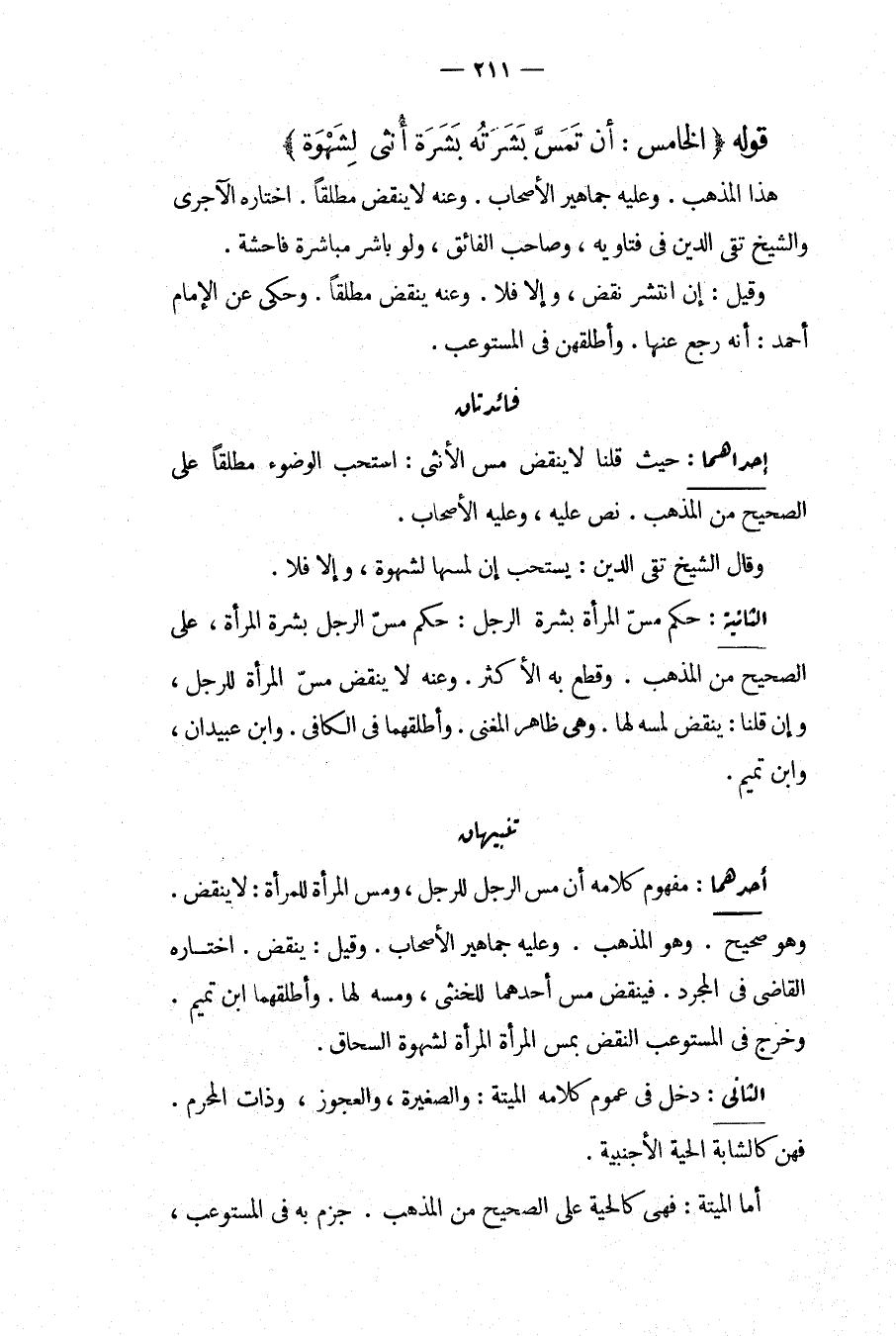 قَوْلُهُ {الْخَامِسُ: أَنْ تَمَسَّ بَشَرَتُهُ بَشَرَةَ أُنْثَى لِشَهْوَةٍ} هَذَا الْمَذْهَبُ. وَعَلَيْهِ جَمَاهِيرُ الْأَصْحَابِ. وَعَنْهُ لَا يَنْقُضُ مُطْلَقًا، اخْتَارَهُ الْآجُرِّيُّ وَالشَّيْخُ تَقِيُّ الدِّينِ فِي فَتَاوِيهِ، وَصَاحِبُ الْفَائِقِ، وَلَوْ بَاشَرَ مُبَاشَرَةً فَاحِشَةً. وَقِيلَ: إنْ انْتَشَرَ نَقَضَ، وَإِلَّا فَلَا. وَعَنْهُ يَنْقُضُ مُطْلَقًا. وَحُكِيَ عَنْ الْإِمَامِ أَحْمَدَ: أَنَّهُ رَجَعَ عَنْهَا. وَأَطْلَقَهُنَّ فِي الْمُسْتَوْعِبِ.