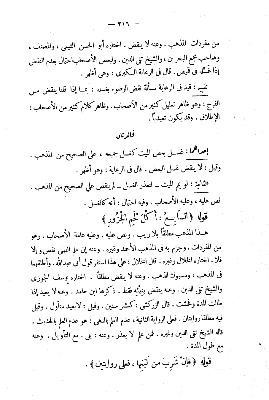 قَوْلُهُ {السَّابِعُ: أَكْلُ لَحْمِ الْجَزُورِ} هَذَا الْمَذْهَبُ مُطْلَقًا بِلَا رَيْبٍ، وَنَصَّ عَلَيْهِ. وَعَلَيْهِ عَامَّةُ الْأَصْحَابِ. وَهُوَ مِنْ الْمُفْرَدَاتِ، وَجَزَمَ بِهِ فِي الْمُذْهَبِ الْأَحْمَدِ وَغَيْرِهِ. وَعَنْهُ إنْ عَلِمَ النَّهْيَ نَقَضَ وَإِلَّا فَلَا، اخْتَارَهُ الْخَلَّالُ وَغَيْرُهُ. قَالَ الْخَلَّالُ: عَلَى هَذَا اسْتَقَرَّ قَوْلُ أَبِي عَبْدِ اللَّهِ. وَأَطْلَقَهُمَا فِي الْمُذْهَبِ، وَمَسْبُوكِ الذَّهَبِ. وَعَنْهُ لَا يَنْقُضُ مُطْلَقًا، اخْتَارَهُ يُوسُفُ الْجَوْزِيُّ وَالشَّيْخُ تَقِيُّ الدِّينِ. وَعَنْهُ يَنْقُضُ بِنَيْئِهِ فَقَطْ. ذَكَرَهَا ابْنُ حَامِدٍ. وَعَنْهُ لَا يُعِيدُ إذَا طَالَتْ الْمُدَّةُ وَفَحُشَتْ. قَالَ الزَّرْكَشِيُّ: كَعَشْرِ سِنِينَ. وَقِيلَ: لَا يُعِيدُ مُتَأَوِّلٌ. وَقِيلَ فِيهِ مُطْلَقًا رِوَايَتَانِ. فَعَلَى الرِّوَايَةِ الثَّانِيَةِ، عَدَمُ الْعِلْمِ بِالنَّهْيِ: هُوَ عَدَمُ الْعِلْمِ بِالْحَدِيثِ. قَالَهُ الشَّيْخُ تَقِيُّ الدِّينِ وَغَيْرُهُ. فَمَنْ عَلِمَ لَا يُعْذَرُ. وَعَنْهُ: بَلَى. مَعَ التَّأْوِيلِ. وَعَنْهُ مَعَ طُولِ الْمُدَّةِ. قَوْلُهُ {فَإِنْ شَرِبَ مِنْ لَبَنِهَا، فَعَلَى رِوَايَتَيْنِ} .