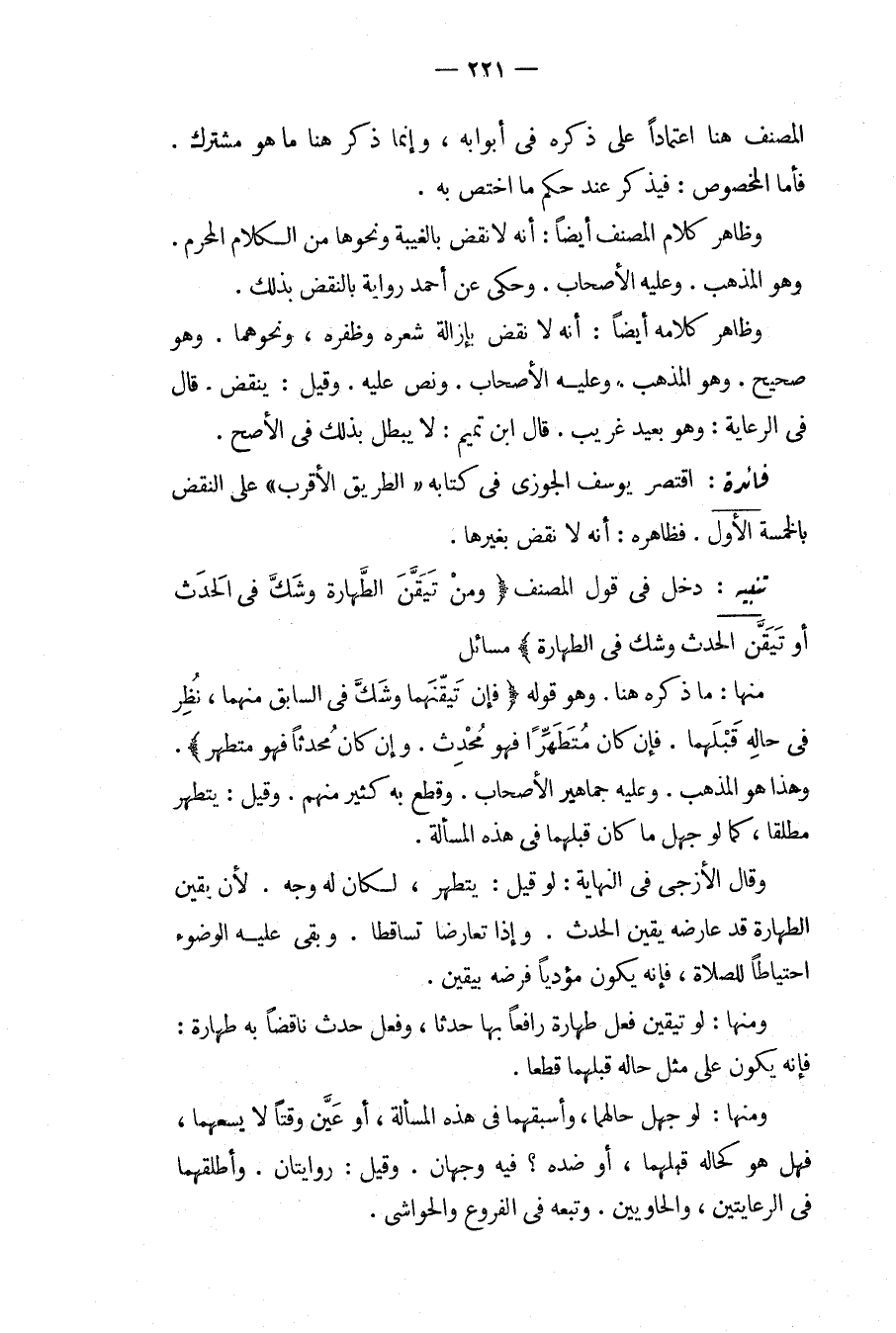 الْمُصَنِّفُ هُنَا اعْتِمَادًا عَلَى ذِكْرِهِ فِي أَبْوَابِهِ، وَإِنَّمَا ذَكَرَ هُنَا مَا هُوَ مُشْتَرَكٌ. فَأَمَّا الْمَخْصُوصُ: فَيُذْكَرُ عِنْدَ حُكْمِ مَا اُخْتُصَّ بِهِ. وَظَاهِرُ كَلَامِ الْمُصَنِّفِ أَيْضًا: أَنَّهُ لَا نَقْضَ بِالْغِيبَةِ وَنَحْوِهَا مِنْ الْكَلَامِ الْمُحَرَّمِ، وَهُوَ الْمَذْهَبُ. وَعَلَيْهِ الْأَصْحَابُ. وَحَكَى عَنْ أَحْمَدَ رِوَايَةً بِالنَّقْضِ بِذَلِكَ. وَظَاهِرُ كَلَامِهِ أَيْضًا: أَنَّهُ لَا نَقْضَ بِإِزَالَةِ شَعْرِهِ وَظُفْرِهِ، وَنَحْوِهِمَا، وَهُوَ صَحِيحٌ، وَهُوَ الْمَذْهَبُ. وَعَلَيْهِ الْأَصْحَابُ، وَنَصَّ عَلَيْهِ، وَقِيلَ: يُنْقَضُ. قَالَ فِي الرِّعَايَةِ: وَهُوَ بَعِيدٌ غَرِيبٌ.