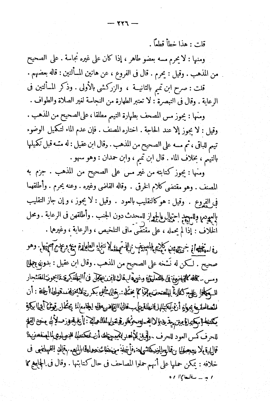 قُلْت: هَذَا خَطَأٌ قَطْعًا. وَمِنْهَا: لَا يَحْرُمُ مَسُّهُ بِعُضْوٍ طَاهِرٍ، إذَا كَانَ عَلَى غَيْرِهِ نَجَاسَةٌ عَلَى الصَّحِيحِ مِنْ الْمَذْهَبِ. وَقِيلَ: يَحْرُمُ. قَالَ فِي الْفُرُوعِ، عَنْ هَاتَيْنِ الْمَسْأَلَتَيْنِ: قَالَهُ بَعْضُهُمْ.