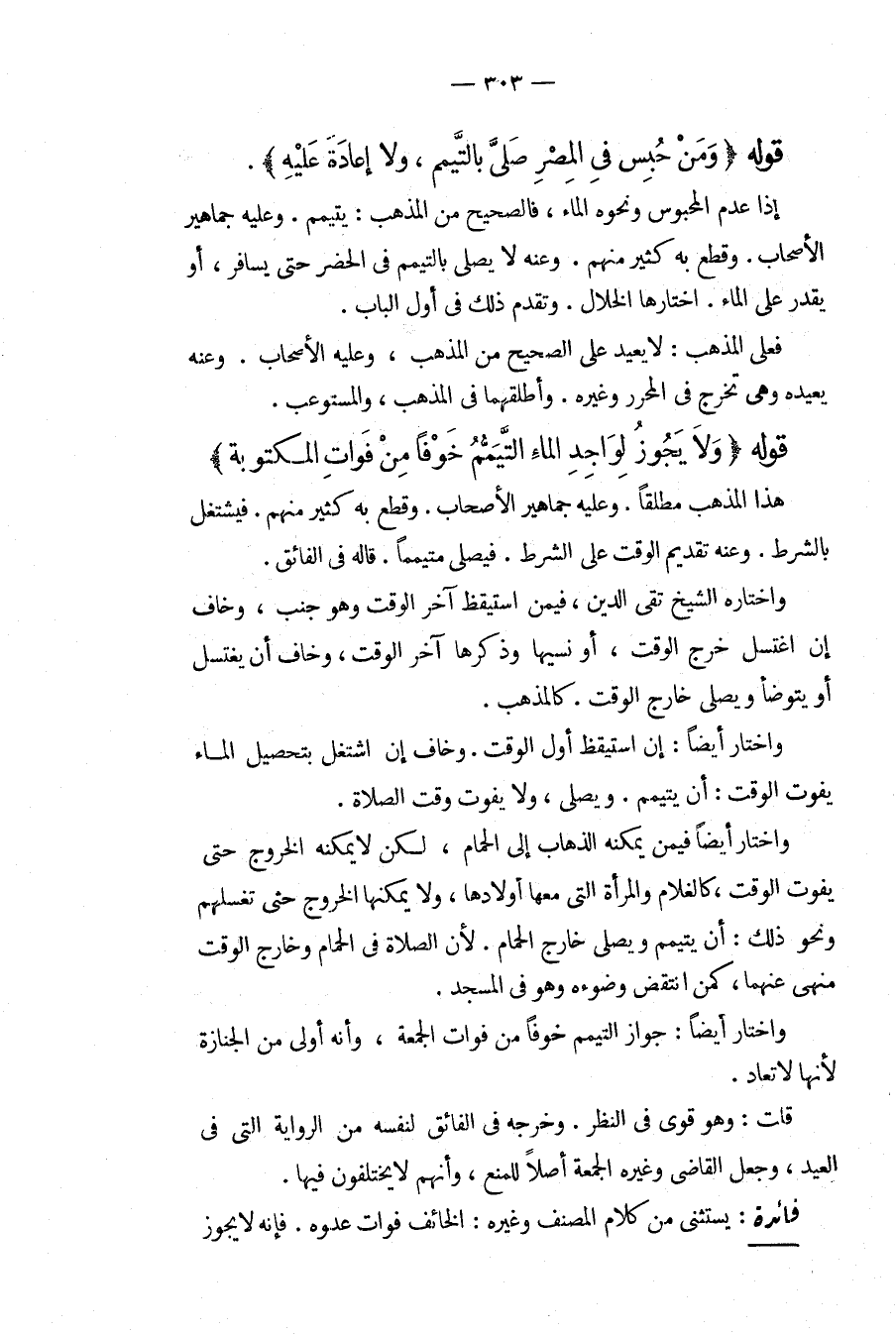 قَوْلُهُ (وَلَا يَجُوزُ لِوَاجِدِ الْمَاءِ التَّيَمُّمُ خَوْفًا مِنْ فَوَاتِ الْمَكْتُوبَةِ) هَذَا الْمَذْهَبُ مُطْلَقًا. وَعَلَيْهِ جَمَاهِيرُ الْأَصْحَابِ، وَقَطَعَ بِهِ كَثِيرٌ مِنْهُمْ. فَيَشْتَغِلُ بِالشَّرْطِ. وَعَنْهُ تَقْدِيمُ الْوَقْتِ عَلَى الشَّرْطِ. فَيُصَلِّي مُتَيَمِّمًا. قَالَهُ فِي الْفَائِقِ، وَاخْتَارَهُ الشَّيْخُ تَقِيُّ الدِّينِ، فِيمَنْ اسْتَيْقَظَ آخِرَ الْوَقْتِ وَهُوَ جُنُبٌ، وَخَافَ إنْ اغْتَسَلَ خَرَجَ الْوَقْتُ، أَوْ نَسِيَهَا وَذَكَرَهَا آخِرَ الْوَقْتِ، وَخَافَ أَنْ يَغْتَسِلَ أَوْ يَتَوَضَّأَ وَيُصَلِّيَ خَارِجَ الْوَقْتِ كَالْمَذْهَبِ، وَاخْتَارَ أَيْضًا: إنْ اسْتَيْقَظَ أَوَّلَ الْوَقْتِ. وَخَافَ إنْ اشْتَغَلَ بِتَحْصِيلِ الْمَاءِ يَفُوتُ الْوَقْتُ: أَنْ يَتَيَمَّمَ وَيُصَلِّيَ، وَلَا يَفُوتَ وَقْتُ الصَّلَاةِ، وَاخْتَارَ أَيْضًا فِيمَنْ يُمْكِنُهُ الذَّهَابُ إلَى الْحَمَّامِ، لَكِنْ لَا يُمْكِنُهُ الْخُرُوجُ حَتَّى يَفُوتَ الْوَقْتُ، كَالْغُلَامِ وَالْمَرْأَةِ الَّتِي مَعَهَا أَوْلَادُهَا، وَلَا يُمْكِنُهَا الْخُرُوجُ حَتَّى تَغْسِلَهُمْ وَنَحْوَ ذَلِكَ: أَنْ يَتَيَمَّمَ وَيُصَلِّيَ خَارِجَ الْحَمَّامِ لِأَنَّ الصَّلَاةَ فِي الْحَمَّامِ وَخَارِجَ الْوَقْتِ مَنْهِيٌّ عَنْهُمَا، كَمَنْ انْتَقَضَ وُضُوءُهُ وَهُوَ فِي الْمَسْجِدِ، وَاخْتَارَ أَيْضًا: جَوَازَ التَّيَمُّمِ خَوْفًا مِنْ فَوَاتِ الْجُمُعَةِ، وَأَنَّهُ أَوْلَى مِنْ الْجِنَازَةِ لِأَنَّهَا لَا تُعَادُ. قُلْت: وَهُوَ قَوِيٌّ فِي النَّظَرِ. وَخَرَّجَهُ فِي الْفَائِقِ لِنَفْسِهِ مِنْ الرِّوَايَةِ الَّتِي فِي الْعِيدِ، وَجَعَلَ الْقَاضِي وَغَيْرُهُ الْجُمُعَةَ أَصْلًا لِلْمَنْعِ، وَأَنَّهُمْ لَا يَخْتَلِفُونَ فِيهَا.