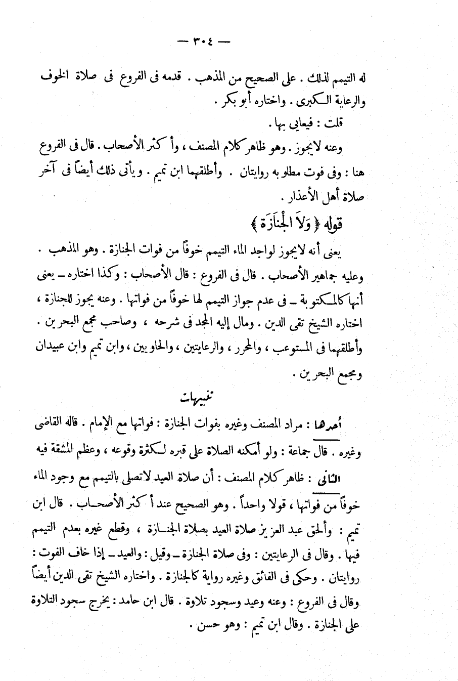 أَحَدُهَا: مُرَادُ الْمُصَنِّفِ وَغَيْرِهِ بِفَوَاتِ الْجِنَازَةِ: فَوَاتُهَا مَعَ الْإِمَامِ. قَالَهُ الْقَاضِي وَغَيْرُهُ. قَالَ جَمَاعَةٌ: وَلَوْ أَمْكَنَهُ الصَّلَاةُ عَلَى قَبْرِهِ لِكَثْرَةِ وُقُوعِهِ، وَعِظَمِ الْمَشَقَّةِ فِيهِ الثَّانِي: ظَاهِرُ كَلَامِ الْمُصَنِّفِ: أَنَّ صَلَاةَ الْعِيدِ لَا تُصَلَّى بِالتَّيَمُّمِ مَعَ وُجُودِ الْمَاءِ خَوْفًا مِنْ فَوَاتِهَا، قَوْلًا وَاحِدًا، وَهُوَ الصَّحِيحُ عِنْدَ أَكْثَرِ الْأَصْحَابِ. قَالَ ابْنُ تَمِيمٍ: وَأَلْحَقَ عَبْدُ الْعَزِيزِ صَلَاةَ الْعِيدِ بِصَلَاةِ الْجِنَازَةِ، وَقَطَعَ غَيْرُهُ بِعَدَمِ التَّيَمُّمِ فِيهَا. وَقَالَ فِي الرِّعَايَتَيْنِ: وَفِي صَلَاةِ الْجِنَازَةِ وَقِيلَ: وَالْعِيدِ إذَا خَافَ الْفَوْتَ: رِوَايَتَانِ. وَحَكَى فِي الْفَائِقِ وَغَيْرِهِ رِوَايَةً كَالْجِنَازَةِ، وَاخْتَارَهُ الشَّيْخُ تَقِيُّ الدِّينِ أَيْضًا وَقَالَ فِي الْفُرُوعِ: وَعَنْهُ وَعِيدٌ وَسُجُودُ تِلَاوَةٍ. قَالَ ابْنُ حَامِدٍ: يَخْرُجُ سُجُودُ التِّلَاوَةِ عَلَى الْجِنَازَةِ. وَقَالَ ابْنُ تَمِيمٍ: وَهُوَ حَسَنٌ.