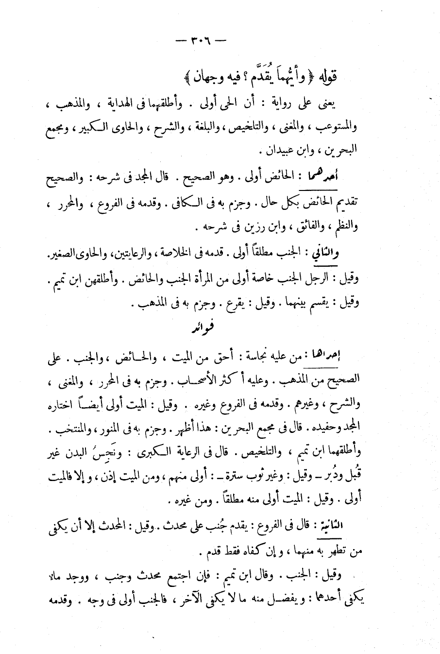 قَوْلُهُ (وَأَيُّهُمَا يُقَدَّمُ؟ فِيهِ وَجْهَانِ) يَعْنِي عَلَى رِوَايَةٍ: أَنَّ الْحَيَّ أَوْلَى. وَأَطْلَقَهُمَا فِي الْهِدَايَةِ، وَالْمُذْهَبِ، وَالْمُسْتَوْعِبِ، وَالْمُغْنِي، وَالتَّلْخِيصِ، وَالْبُلْغَةِ، وَالشَّرْحِ، وَالْحَاوِي الْكَبِيرِ، وَمَجْمَعِ الْبَحْرَيْنِ، وَابْنُ عُبَيْدَانَ. أَحَدُهُمَا: الْحَائِضُ أَوْلَى، وَهُوَ الصَّحِيحُ، قَالَ الْمَجْدُ فِي شَرْحِهِ: وَالصَّحِيحُ تَقْدِيمُ الْحَائِضِ بِكُلِّ حَالٍ، وَجَزَمَ بِهِ فِي الْكَافِي، وَقَدَّمَهُ فِي الْفُرُوعِ، وَالْمُحَرَّرِ، وَالنَّظْمِ، وَالْفَائِقِ، وَابْنُ رَزِينٍ فِي شَرْحِهِ. وَالثَّانِي: الْجُنُبُ مُطْلَقًا أَوْلَى، قَدَّمَهُ فِي الْخُلَاصَةِ، وَالرِّعَايَتَيْنِ، وَالْحَاوِي الصَّغِيرِ. وَقِيلَ: الرَّجُلُ الْجُنُبُ خَاصَّةً أَوْلَى مِنْ الْمَرْأَةِ الْجُنُبِ وَالْحَائِضِ. وَأَطْلَقَهُنَّ ابْنُ تَمِيمٍ. وَقِيلَ: يُقْسَمُ بَيْنَهُمَا. وَقِيلَ: يُقْرَعُ، وَجَزَمَ بِهِ فِي الْمُذْهَبِ.