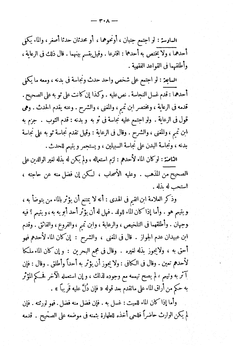 السَّادِسَةُ: لَوْ اجْتَمَعَ جُنُبَانِ، أَوْ نَحْوُهُمَا، أَوْ مُحْدِثَانِ حَدَثًا أَصْغَرَ، وَالْمَاءُ يَكْفِي أَحَدَهُمَا، وَلَا يَخْتَصُّ بِهِ أَحَدُهُمَا: اقْتَرَعَا. وَقِيلَ يُقْسَمُ بَيْنَهُمَا. قَالَ ذَلِكَ فِي الرِّعَايَةِ، وَأَطْلَقَهُمَا فِي الْقَوَاعِدِ الْفِقْهِيَّةِ. السَّابِعَةُ: لَوْ اجْتَمَعَ عَلَى شَخْصٍ وَاحِدٍ حَدَثٌ وَنَجَاسَةٌ فِي بَدَنِهِ، وَمَعَهُ مَا يَكْفِي أَحَدَهُمَا: قَدَّمَ غَسْلَ النَّجَاسَةِ، نَصَّ عَلَيْهِ. وَكَذَا إنْ كَانَتْ عَلَى ثَوْبِهِ عَلَى الصَّحِيحِ، قَدَّمَهُ فِي الرِّعَايَةِ، وَمُخْتَصَرِ ابْنِ تَمِيمٍ، وَالْمُغْنِي، وَالشَّرْحِ. وَعَنْهُ يُقَدَّمُ الْحَدَثُ. وَهِيَ قَوْلٌ فِي الرِّعَايَةِ. وَلَوْ اجْتَمَعَ عَلَيْهِ نَجَاسَةٌ فِي ثَوْبِهِ وَبَدَنِهِ: قَدَّمَ الثَّوْبَ، جَزَمَ بِهِ ابْنُ تَمِيمٍ، وَالْمُغْنِي، وَالشَّرْحُ. وَقَالَ فِي الرِّعَايَةِ: وَقِيلَ تُقَدَّمُ نَجَاسَةُ ثَوْبِهِ عَلَى نَجَاسَةِ بَدَنِهِ، وَنَجَاسَةُ الْبَدَنِ عَلَى نَجَاسَةِ السَّبِيلَيْنِ، وَيَسْتَجْمِرُ وَيَتَيَمَّمُ لِلْحَدَثِ. الثَّامِنَةُ: لَوْ كَانَ الْمَاءُ لِأَحَدِهِمْ: لَزِمَ اسْتِعْمَالُهُ، وَلَمْ يَكُنْ لَهُ بَذْلُهُ لِغَيْرِ الْوَالِدَيْنِ عَلَى الصَّحِيحِ مِنْ الْمَذْهَبِ. وَعَلَيْهِ الْأَصْحَابُ، لَكِنْ إنْ فَضَلَ مِنْهُ عَنْ حَاجَتِهِ، اُسْتُحِبَّ لَهُ بَذْلُهُ. وَذَكَرَ الْعَلَّامَةُ ابْنُ الْقَيِّمِ فِي الْهَدْيِ: أَنَّهُ لَا يَمْتَنِعُ أَنْ يُؤْثِرَ بِالْمَاءِ مَنْ يَتَوَضَّأُ بِهِ، وَيَتَيَمَّمُ هُوَ. وَأَمَّا إذَا كَانَ الْمَاءُ لِلْوَلَدِ. فَهَلْ لَهُ أَنْ يُؤْثِرَ أَحَدَ أَبَوَيْهِ بِهِ، وَيَتَيَمَّمَ؟ فِيهِ وَجْهَانِ. وَأَطْلَقَهُمَا فِي التَّلْخِيصِ، وَالرِّعَايَةِ، وَابْنُ تَمِيمٍ، وَالْفُرُوعِ، وَالْفَائِقِ. وَقَدَّمَ ابْنُ عُبَيْدَانَ عَدَمَ الْجَوَازِ. قَالَ فِي الْمُغْنِي، وَالشَّرْحِ: إنْ كَانَ الْمَاءُ لِأَحَدِهِمْ فَهُوَ أَحَقُّ بِهِ، وَلَا يَجُوزُ بَذْلُهُ لِغَيْرِهِ. وَقَالَ فِي مَجْمَعِ الْبَحْرَيْنِ: وَإِنْ كَانَ الْمَاءُ مِلْكًا لِأَحَدِهِمْ تَعَيَّنَ. وَقَالَ فِي الْكَافِي: وَلَا يَجُوزُ أَنْ يُؤْثِرَ بِهِ أَحَدًا وَأَطْلَقَ. وَقَالَ: فَإِنْ آثَرَ بِهِ وَتَيَمَّمَ، لَمْ يَصِحَّ تَيَمُّمُهُ مَعَ وُجُودِهِ لِذَلِكَ، وَإِنْ اسْتَعْمَلَهُ الْآخَرُ فَحُكْمُ الْمُؤْثَرِ بِهِ حُكْمُ مَنْ أَرَاقَ الْمَاءَ عَلَى مَا تَقَدَّمَ بَعْدَ قَوْلِهِ " فَإِنْ دَلَّ عَلَيْهِ قَرِيبًا ". وَأَمَّا إذَا كَانَ الْمَاءُ لِلْمَيِّتِ: غُسِّلَ بِهِ. فَإِنْ فَضَلَ مِنْهُ فَضْلٌ. فَهُوَ لِوَرَثَتِهِ. فَإِنْ لَمْ يَكُنْ الْوَارِثُ حَاضِرًا فَلِلْحَيِّ أَخْذُهُ لِلطَّهَارَةِ بِثَمَنِهِ فِي مَوْضِعِهِ عَلَى الصَّحِيحِ، قَدَّمَهُ
