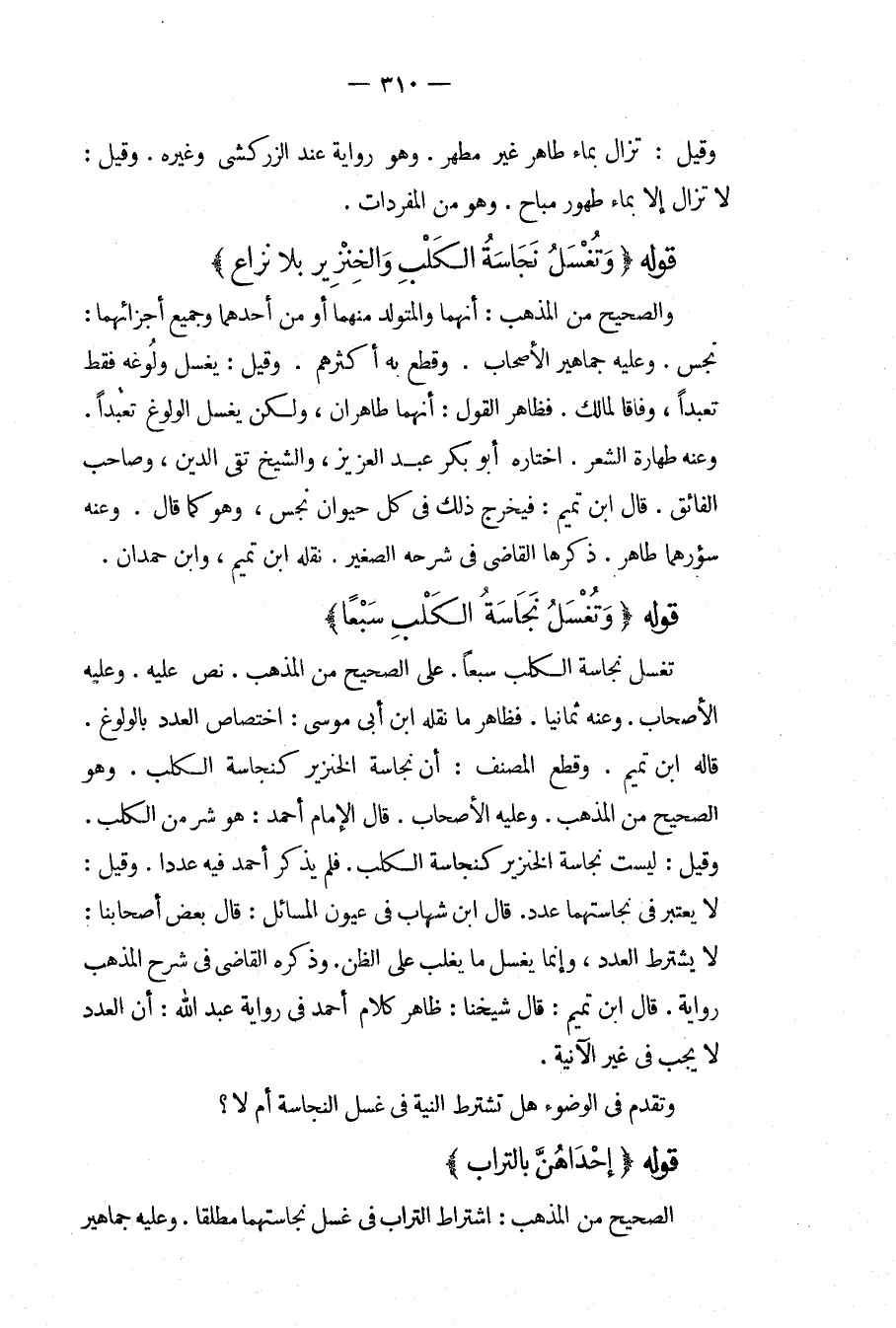 وَذَكَرَهُ الْقَاضِي فِي شَرْحِ الْمُذْهَبِ رِوَايَةً، قَالَ ابْنُ تَمِيمٍ: قَالَ شَيْخُنَا: ظَاهِرُ كَلَامِ أَحْمَدَ فِي رِوَايَةِ عَبْدِ اللَّهِ: أَنَّ الْعَدَدَ لَا يَجِبُ فِي غَيْرِ الْآنِيَةِ وَتَقَدَّمَ فِي الْوُضُوءِ هَلْ تُشْتَرَطُ النِّيَّةُ فِي غَسْلِ النَّجَاسَةِ أَمْ لَا؟ قَوْلُهُ (إحْدَاهُنَّ بِالتُّرَابِ) الصَّحِيحُ مِنْ الْمَذْهَبِ: اشْتِرَاطُ التُّرَابِ فِي غَسْلِ نَجَاسَتِهِمَا مُطْلَقًا. وَعَلَيْهِ جَمَاهِيرُ