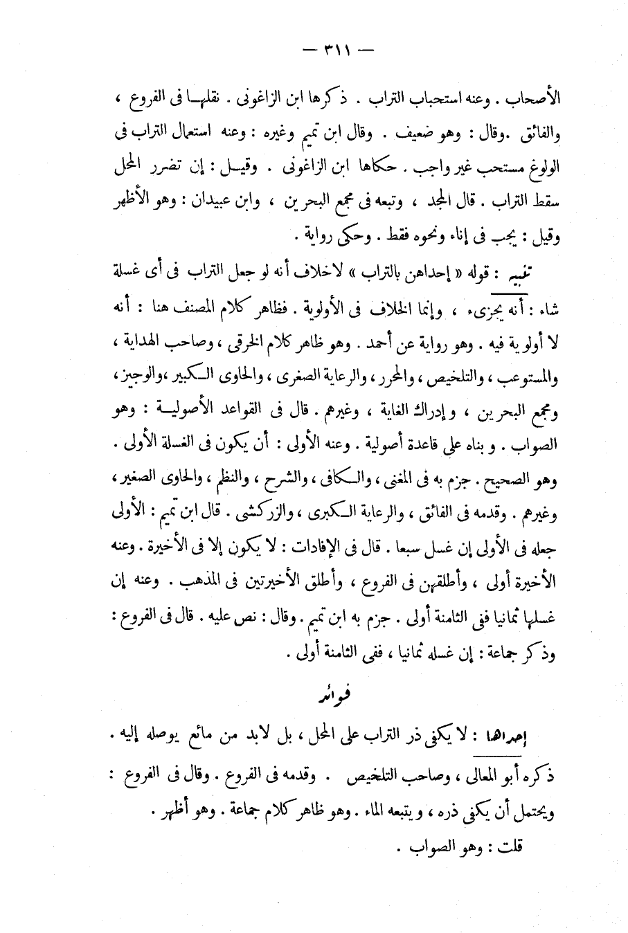 تَنْبِيهٌ: قَوْلُهُ " إحْدَاهُنَّ بِالتُّرَابِ " لَا خِلَافَ أَنَّهُ لَوْ جَعَلَ التُّرَابَ فِي أَيِّ غَسْلَةٍ شَاءَ: أَنَّهُ يُجْزِئُ، وَإِنَّمَا الْخِلَافُ فِي الْأَوْلَوِيَّةِ. فَظَاهِرُ كَلَامِ الْمُصَنِّفِ هُنَا: أَنَّهُ لَا أَوْلَوِيَّةَ فِيهِ، وَهُوَ رِوَايَةٌ عَنْ أَحْمَدَ، وَهُوَ ظَاهِرُ كَلَامِ الْخِرَقِيِّ، وَصَاحِبِ الْهِدَايَةِ، وَالْمُسْتَوْعِبِ، وَالتَّلْخِيصِ، وَالْمُحَرَّرِ، وَالرِّعَايَةِ الصُّغْرَى، وَالْحَاوِي الْكَبِيرِ، وَالْوَجِيزِ، وَمَجْمَعِ الْبَحْرَيْنِ، وَإِدْرَاكِ الْغَايَةِ، وَغَيْرِهِمْ. قَالَ فِي الْقَوَاعِدِ الْأُصُولِيَّةِ: وَهُوَ الصَّوَابُ. وَبَنَاهُ عَلَى قَاعِدَةٍ أُصُولِيَّةٍ.