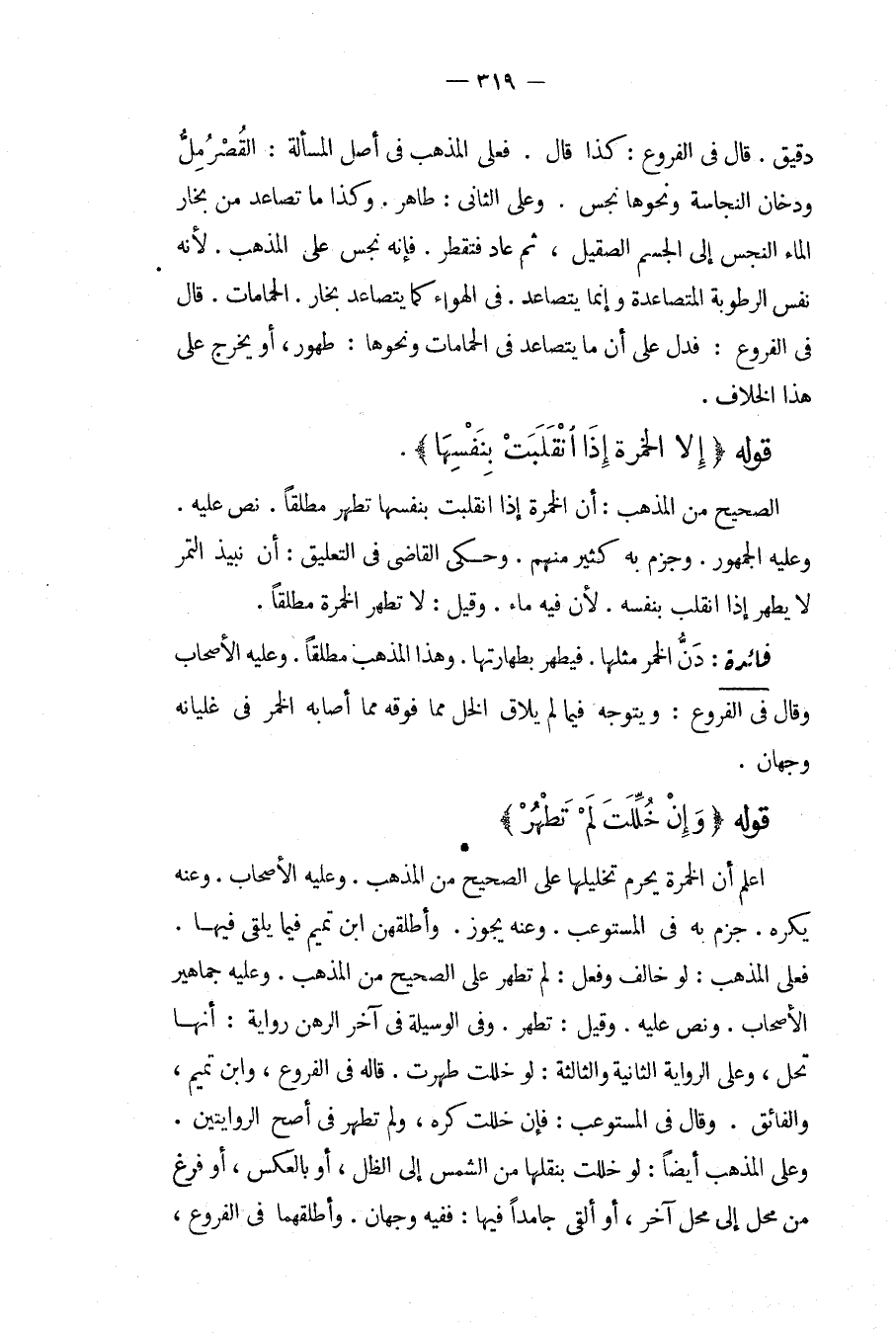 قَوْلُهُ (إلَّا الْخَمْرَةَ إذَا انْقَلَبَتْ بِنَفْسِهَا) ، الصَّحِيحُ مِنْ الْمَذْهَبِ: أَنَّ الْخَمْرَةَ إذَا انْقَلَبَتْ بِنَفْسِهَا تَطْهُرُ مُطْلَقًا، نَصَّ عَلَيْهِ. وَعَلَيْهِ الْجُمْهُورُ، وَجَزَمَ بِهِ كَثِيرٌ مِنْهُمْ. وَحَكَى الْقَاضِي فِي التَّعْلِيقِ: أَنَّ نَبِيذَ التَّمْرِ لَا يَطْهُرُ إذَا انْقَلَبَ بِنَفْسِهِ؛ لِأَنَّ فِيهِ مَاءً. وَقِيلَ: لَا تَطْهُرُ الْخَمْرَةُ مُطْلَقًا.