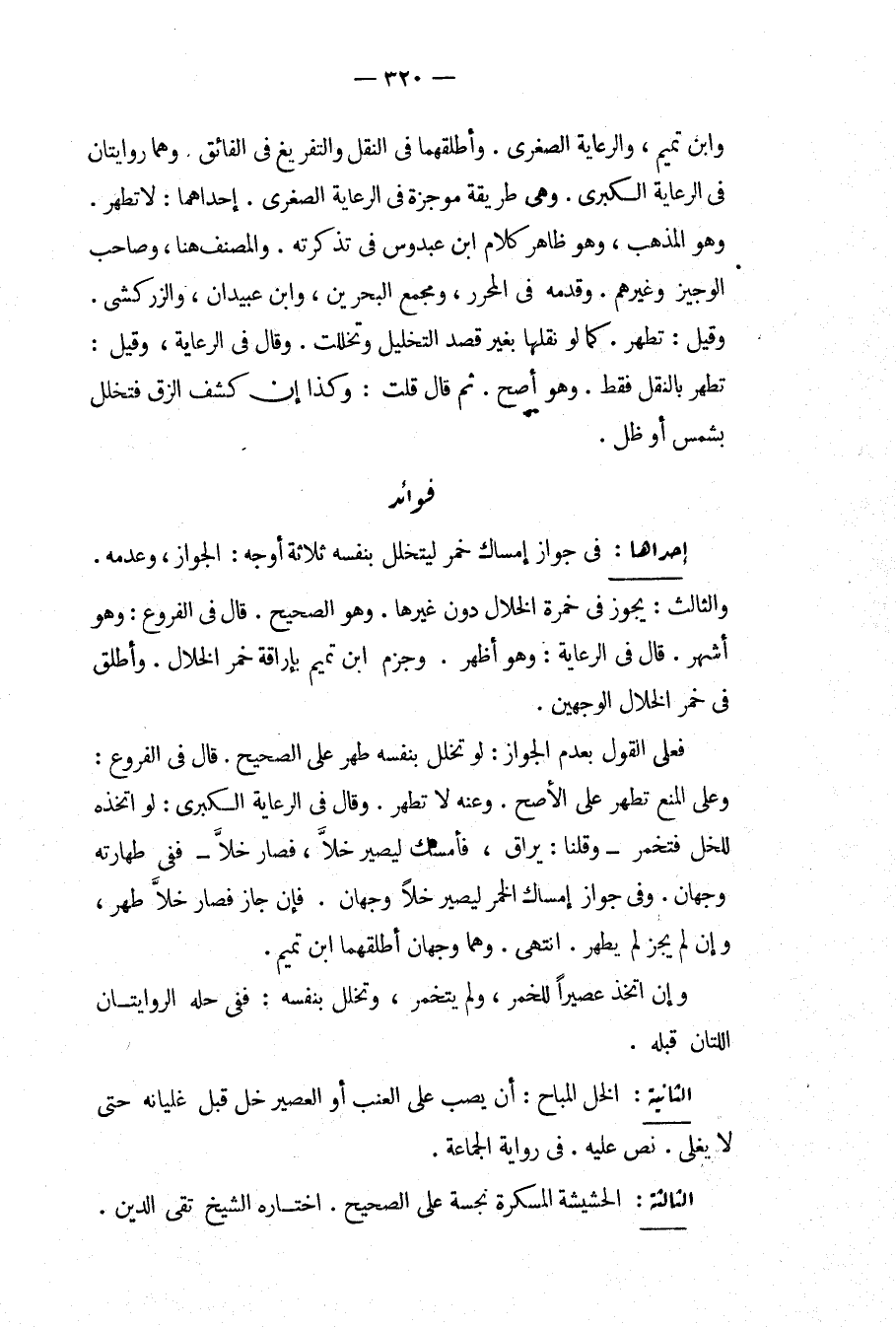 إحْدَاهُمَا: فِي جَوَازِ إمْسَاكِ خَمْرٍ لِيَتَخَلَّلَ بِنَفْسِهِ ثَلَاثَةُ أَوْجُهٍ: الْجَوَازُ، وَعَدَمُهُ. وَالثَّالِثُ: يَجُوزُ فِي خَمْرَةِ الْخَلَّالِ دُونَ غَيْرِهَا، وَهُوَ الصَّحِيحُ، قَالَ فِي الْفُرُوعِ: وَهُوَ أَشْهَرُ، قَالَ فِي الرِّعَايَةِ: وَهُوَ أَظْهَرُ، وَجَزَمَ ابْنُ تَمِيمٍ بِإِرَاقَةِ خَمْرِ الْخَلَّالِ. وَأَطْلَقَ فِي خَمْرِ الْخَلَّالِ الْوَجْهَانِ. فَعَلَى الْقَوْلِ بِعَدَمِ الْجَوَازِ: لَوْ تَخَلَّلَ بِنَفْسِهِ طَهُرَ عَلَى الصَّحِيحِ. قَالَ فِي الْفُرُوعِ: وَعَلَى الْمَنْعِ تَطْهُرُ عَلَى الْأَصَحِّ، وَعَنْهُ لَا تَطْهُرُ. وَقَالَ فِي الرِّعَايَةِ الْكُبْرَى: لَوْ اتَّخَذَهُ لِلْخَلِّ فَتَخَمَّرَ وَقُلْنَا: يُرَاقُ، فَأُمْسِكَ لِيَصِيرَ خَلًّا، فَصَارَ خَلًّا فَفِي طَهَارَتِهِ وَجْهَانِ. وَفِي جَوَازِ إمْسَاكِ الْخَمْرِ لِيَصِيرَ خَلًّا وَجْهَانِ. فَإِنْ جَازَ فَصَارَ خَلًّا طَهُرَ، وَإِنْ لَمْ يَجُزْ لَمْ يَطْهُرْ. انْتَهَى.