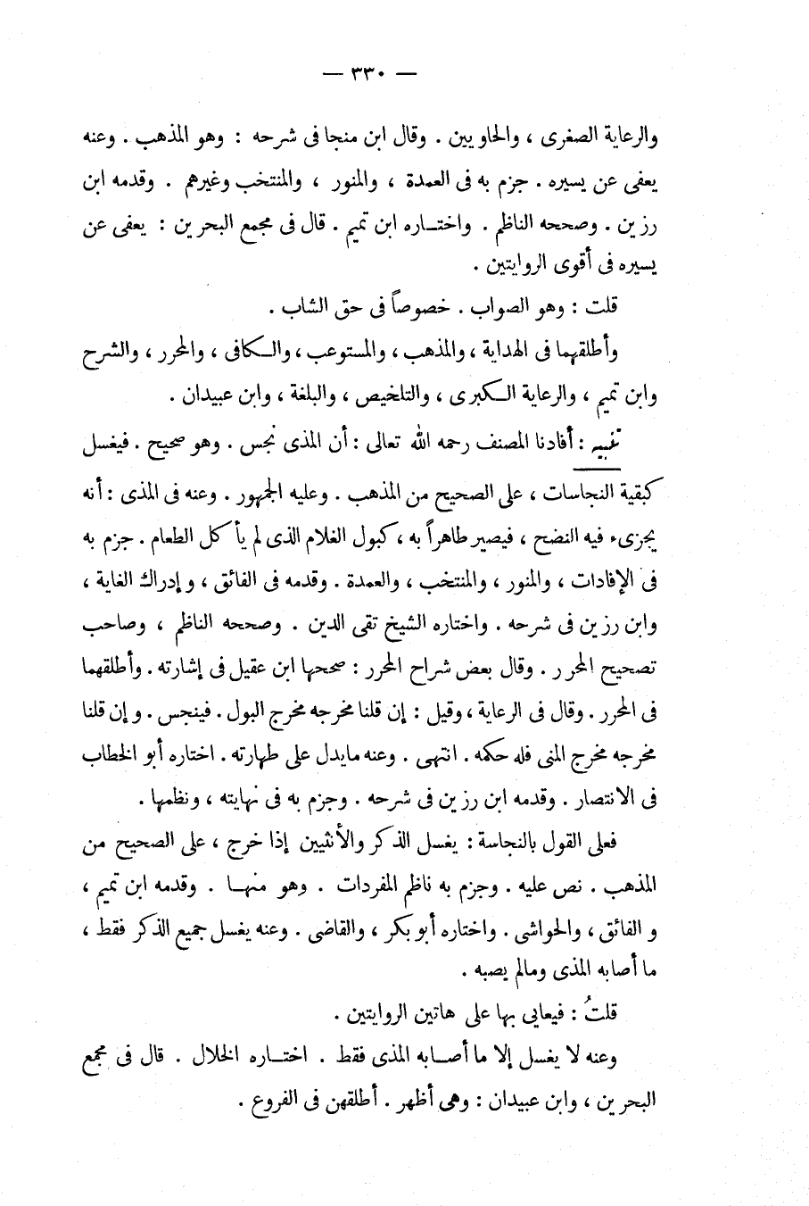 وَالرِّعَايَةِ الصُّغْرَى، وَالْحَاوِيَيْنِ. وَقَالَ ابْنُ مُنَجَّا فِي شَرْحِهِ: وَهُوَ الْمَذْهَبُ، وَعَنْهُ يُعْفَى عَنْ يَسِيرِهِ، جَزَمَ بِهِ فِي الْعُمْدَةِ، وَالْمُنَوِّرِ، وَالْمُنْتَخَبِ وَغَيْرِهِمْ، وَقَدَّمَهُ ابْنُ رَزِينٍ. وَصَحَّحَهُ النَّاظِمُ، وَاخْتَارَهُ ابْنُ تَمِيمٍ. قَالَ فِي مَجْمَعِ الْبَحْرَيْنِ: يُعْفَى عَنْ يَسِيرِهِ فِي أَقْوَى الرِّوَايَتَيْنِ، قُلْت: وَهُوَ الصَّوَابُ، خُصُوصًا فِي حَقِّ الشَّابِّ. وَأَطْلَقَهُمَا فِي الْهِدَايَةِ، وَالْمُذْهَبِ، وَالْمُسْتَوْعِبِ، وَالْكَافِي، وَالْمُحَرَّرِ، وَالشَّرْحِ وَابْنُ تَمِيمٍ، وَالرِّعَايَةِ الْكُبْرَى، وَالتَّلْخِيصِ، وَالْبُلْغَةِ، وَابْنُ عُبَيْدَانِ.