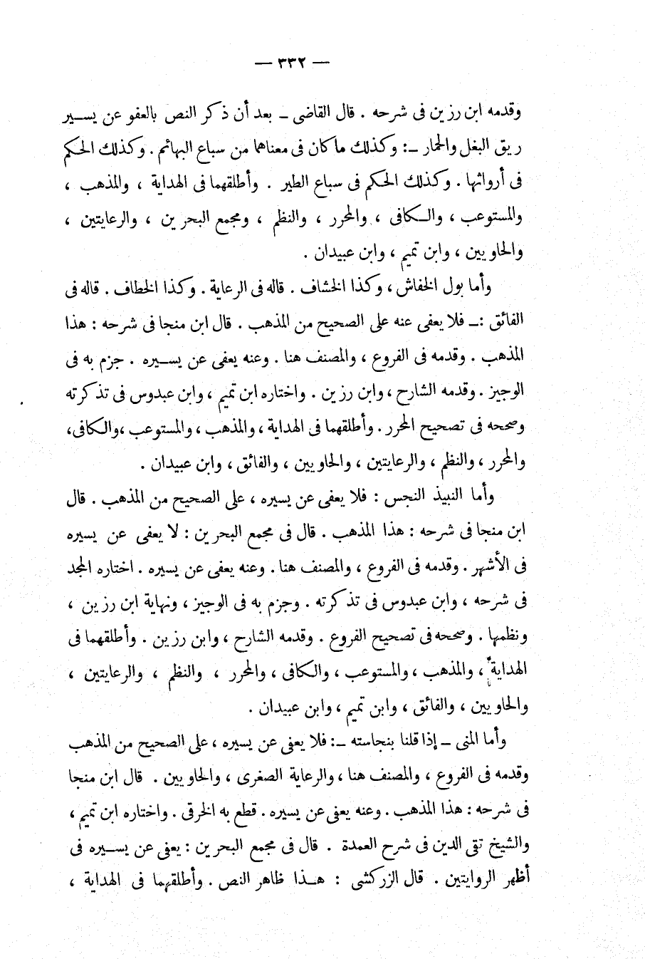 وَقَدَّمَهُ ابْنُ رَزِينٍ فِي شَرْحِهِ. قَالَ الْقَاضِي بَعْدَ أَنْ ذَكَرَ النَّصَّ بِالْعَفْوِ عَنْ يَسِيرِ رِيقِ الْبَغْلِ وَالْحِمَارِ: وَكَذَلِكَ مَا كَانَ فِي مَعْنَاهُمَا مِنْ سِبَاعِ الْبَهَائِمِ. وَكَذَلِكَ الْحُكْمُ فِي أَرْوَاثِهَا. وَكَذَلِكَ الْحُكْمُ فِي سِبَاعِ الطَّيْرِ. وَأَطْلَقَهُمَا فِي الْهِدَايَةِ، وَالْمُذْهَبِ، وَالْمُسْتَوْعِبِ، وَالْكَافِي، وَالْمُحَرَّرِ، وَالنَّظْمِ، وَمَجْمَعِ الْبَحْرَيْنِ، وَالرِّعَايَتَيْنِ، وَالْحَاوِيَيْنِ، وَابْنُ تَمِيمٍ، وَابْنُ عُبَيْدَانِ. وَأَمَّا بَوْلُ الْخُفَّاشِ، وَكَذَا الْخِشَافُ. قَالَهُ فِي الرِّعَايَةِ. وَكَذَا الْخُطَّافُ. قَالَهُ فِي الْفَائِقِ: فَلَا يُعْفَى عَنْهُ عَلَى الصَّحِيحِ مِنْ الْمَذْهَبِ. قَالَ ابْنُ مُنَجَّا فِي شَرْحِهِ: هَذَا الْمَذْهَبُ، وَقَدَّمَهُ فِي الْفُرُوعِ، وَالْمُصَنِّفُ هُنَا. وَعَنْهُ يُعْفَى عَنْ يَسِيرِهِ، جَزَمَ بِهِ فِي الْوَجِيزِ، وَقَدَّمَهُ الشَّارِحُ، وَابْنُ رَزِينٍ، وَاخْتَارَهُ ابْنُ تَمِيمٍ، وَابْنُ عَبْدُوسٍ فِي تَذْكِرَتِهِ وَصَحَّحَهُ فِي تَصْحِيحِ الْمُحَرَّرِ. وَأَطْلَقَهُمَا فِي الْهِدَايَةِ، وَالْمُذْهَبِ، وَالْمُسْتَوْعِبِ، وَالْكَافِي، وَالْمُحَرَّرِ، وَالنَّظْمِ، وَالرِّعَايَتَيْنِ، وَالْحَاوِيَيْنِ، وَالْفَائِقِ، وَابْنُ عُبَيْدَانِ.