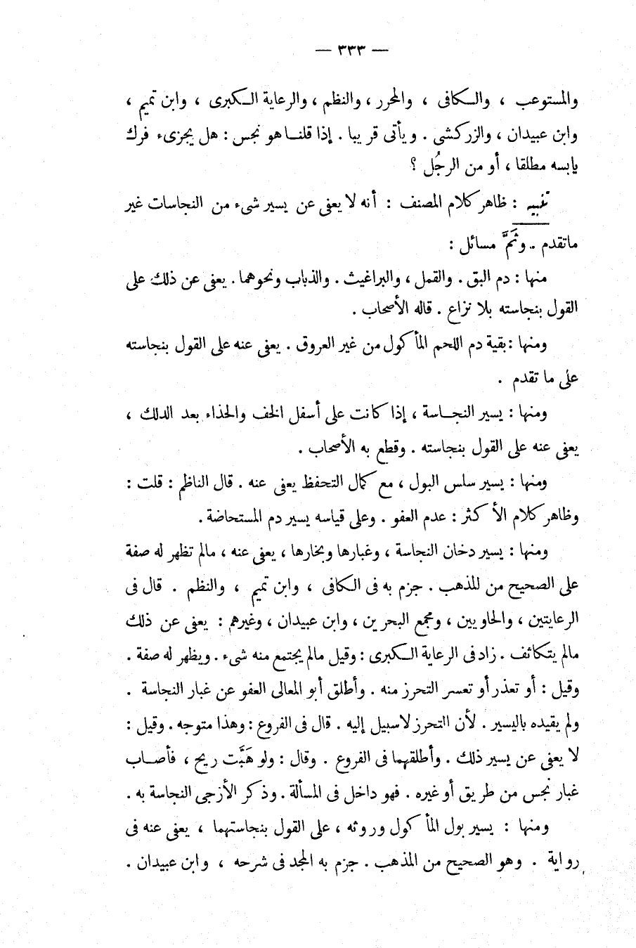 وَالْمُسْتَوْعِبِ، وَالْكَافِي، وَالْمُحَرَّرِ، وَالنَّظْمِ، وَالرِّعَايَةِ الْكُبْرَى، وَابْنُ تَمِيمٍ، وَابْنُ عُبَيْدَانِ، وَالزَّرْكَشِيُّ وَيَأْتِي قَرِيبًا. إذَا قُلْنَا هُوَ نَجِسٌ: هَلْ يُجْزِئُ فَرْكُ يَابِسِهِ مُطْلَقًا، أَوْ مِنْ الرَّجُلِ؟ تَنْبِيهٌ: ظَاهِرُ كَلَامِ الْمُصَنِّفِ: أَنَّهُ لَا يُعْفَى عَنْ يَسِيرِ شَيْءٍ مِنْ النَّجَاسَاتِ غَيْرِ مَا تَقَدَّمَ.