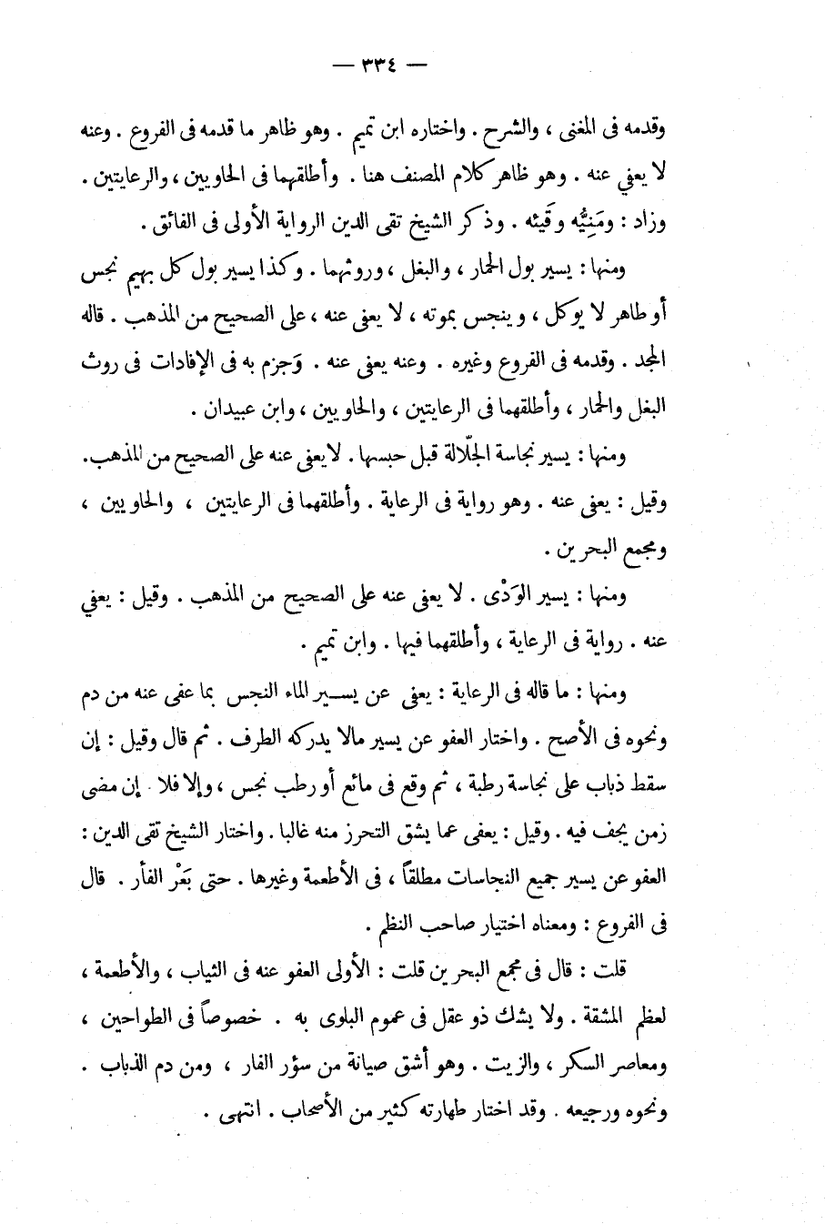 وَمِنْهَا: مَا قَالَهُ فِي الرِّعَايَةِ: يُعْفَى عَنْ يَسِيرِ الْمَاءِ النَّجِسِ بِمَا عُفِيَ عَنْهُ مِنْ دَمٍ وَنَحْوِهِ فِي الْأَصَحِّ. وَاخْتَارَ الْعَفْوَ عَنْ يَسِيرِ مَا لَا يُدْرِكُهُ الطَّرْفُ. ثُمَّ قَالَ وَقِيلَ: إنْ سَقَطَ ذُبَابٌ عَلَى نَجَاسَةٍ رَطْبَةٍ، ثُمَّ وَقَعَ فِي مَائِعٍ أَوْ رَطْبٍ نَجِسٍ، وَإِلَّا فَلَا. إنْ مَضَى زَمَنٌ يَجِفُّ فِيهِ. وَقِيلَ: يُعْفَى عَمَّا يَشُقُّ التَّحَرُّزُ مِنْهُ غَالِبًا. وَاخْتَارَ الشَّيْخُ تَقِيُّ الدِّينِ: الْعَفْوَ عَنْ يَسِيرِ جَمِيعِ النَّجَاسَاتِ مُطْلَقًا، فِي الْأَطْعِمَةِ وَغَيْرِهِمْ. حَتَّى بَعْرِ الْفَأْرِ. قَالَ فِي الْفُرُوعِ: وَمَعْنَاهُ اخْتِيَارُ صَاحِبِ النَّظْمِ. قُلْت: قَالَ فِي مَجْمَعِ الْبَحْرَيْنِ قُلْت: الْأَوْلَى الْعَفْوُ عَنْهُ فِي الثِّيَابِ، وَالْأَطْعِمَةِ، لِعِظَمِ الْمَشَقَّةِ. وَلَا يَشُكُّ ذُو عَقْلٍ فِي عُمُومِ الْبَلْوَى بِهِ. خُصُوصًا فِي الطَّوَاحِينِ، وَمَعَاصِرِ السُّكَّرِ، وَالزَّيْتِ، وَهُوَ أَشَقُّ صِيَانَةً مِنْ سُؤْرِ الْفَأْرِ، وَمِنْ دَمِ الذُّبَابِ. وَنَحْوِهِ وَرَجِيعِهِ وَقَدْ اخْتَارَ طَهَارَتَهُ كَثِيرٌ مِنْ الْأَصْحَابِ. انْتَهَى.