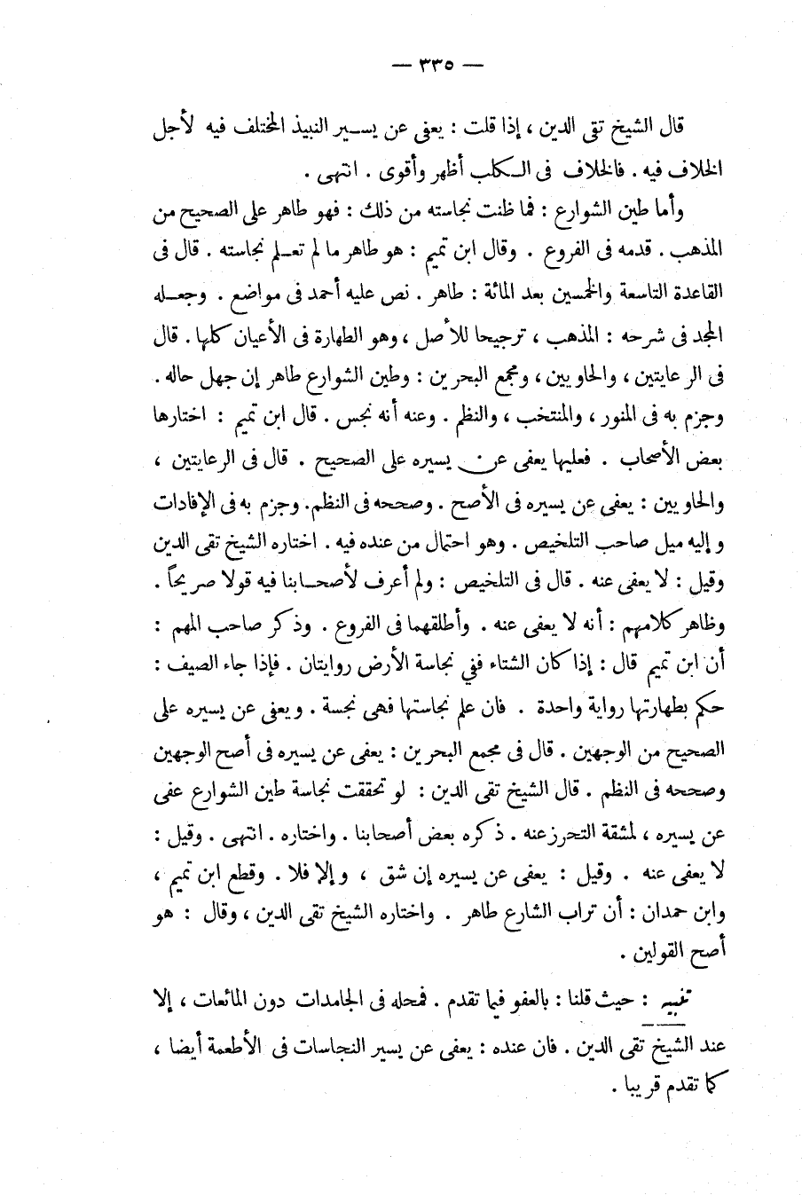 وَأَمَّا طِينُ الشَّوَارِعِ: فَمَا ظُنَّتْ نَجَاسَتُهُ مِنْ ذَلِكَ: فَهُوَ طَاهِرٌ عَلَى الصَّحِيحِ مِنْ الْمَذْهَبِ، قَدَّمَهُ فِي الْفُرُوعِ. وَقَالَ ابْنُ تَمِيمٍ: هُوَ ظَاهِرُ مَا لَمْ تُعْلَمْ نَجَاسَتُهُ. قَالَ فِي الْقَاعِدَةِ التَّاسِعَةِ وَالْخَمْسِينَ بَعْدَ الْمِائَةِ: طَاهِرٌ، نَصَّ عَلَيْهِ أَحْمَدُ فِي مَوَاضِعَ. وَجَعَلَهُ الْمَجْدُ فِي شَرْحِهِ الْمَذْهَبَ، تَرْجِيحًا لِلْأَصْلِ، وَهُوَ الطَّهَارَةُ فِي الْأَعْيَانِ كُلِّهَا. قَالَ فِي الرِّعَايَتَيْنِ، وَالْحَاوِيَيْنِ، وَمَجْمَعِ الْبَحْرَيْنِ: وَطِينُ الشَّوَارِعِ طَاهِرٌ إنْ جُهِلَ حَالُهُ، وَجَزَمَ بِهِ فِي الْمُنَوِّرِ، وَالْمُنْتَخَبِ، وَالنَّظْمِ. وَعَنْهُ أَنَّهُ نَجِسٌ. قَالَ ابْنُ تَمِيمٍ: اخْتَارَهَا بَعْضُ الْأَصْحَابِ. فَعَلَيْهَا يُعْفَى عَنْ يَسِيرِهِ عَلَى الصَّحِيحِ، قَالَ فِي الرِّعَايَتَيْنِ، وَالْحَاوِيَيْنِ: يُعْفَى عَنْ يَسِيرِهِ فِي الْأَصَحِّ. وَصَحَّحَهُ فِي النَّظْمِ، وَجَزَمَ بِهِ فِي الْإِفَادَاتِ وَإِلَيْهِ مَيْلُ صَاحِبِ التَّلْخِيصِ، وَهُوَ احْتِمَالُ مَنْ عِنْدَهُ فِيهِ، اخْتَارَهُ الشَّيْخُ تَقِيُّ الدِّينِ وَقِيلَ: لَا يُعْفَى عَنْهُ. قَالَ فِي التَّلْخِيصِ: وَلَمْ أَعْرِفْ لِأَصْحَابِنَا فِيهِ قَوْلًا صَرِيحًا. وَظَاهِرُ كَلَامِهِمْ: أَنَّهُ لَا يُعْفَى عَنْهُ. وَأَطْلَقَهُمَا فِي الْفُرُوعِ. وَذَكَرَ صَاحِبُ الْمُهِمِّ: أَنَّ ابْنَ تَمِيمٍ قَالَ: إذَا كَانَ الشِّتَاءُ فَفِي نَجَاسَةِ الْأَرْضِ رِوَايَتَانِ. فَإِذَا جَاءَ الصَّيْفُ: حُكِمَ بِطَهَارَتِهَا رِوَايَةً وَاحِدَةً. فَإِنْ عُلِمَ نَجَاسَتُهَا فَهِيَ نَجِسَةٌ. وَيُعْفَى عَنْ يَسِيرِهِ عَلَى الصَّحِيحِ مِنْ الْوَجْهَيْنِ، قَالَ فِي مَجْمَعِ الْبَحْرَيْنِ: يُعْفَى عَنْ يَسِيرِهِ فِي أَصَحِّ الْوَجْهَيْنِ وَصَحَّحَهُ فِي النَّظْمِ. قَالَ الشَّيْخُ تَقِيُّ الدِّينِ: لَوْ تَحَقَّقَتْ نَجَاسَةُ طِينِ الشَّوَارِعِ عُفِيَ عَنْ يَسِيرِهِ، لِمَشَقَّةِ التَّحَرُّزِ عَنْهُ. ذَكَرَهُ بَعْضُ أَصْحَابِنَا. وَاخْتَارَهُ. انْتَهَى.