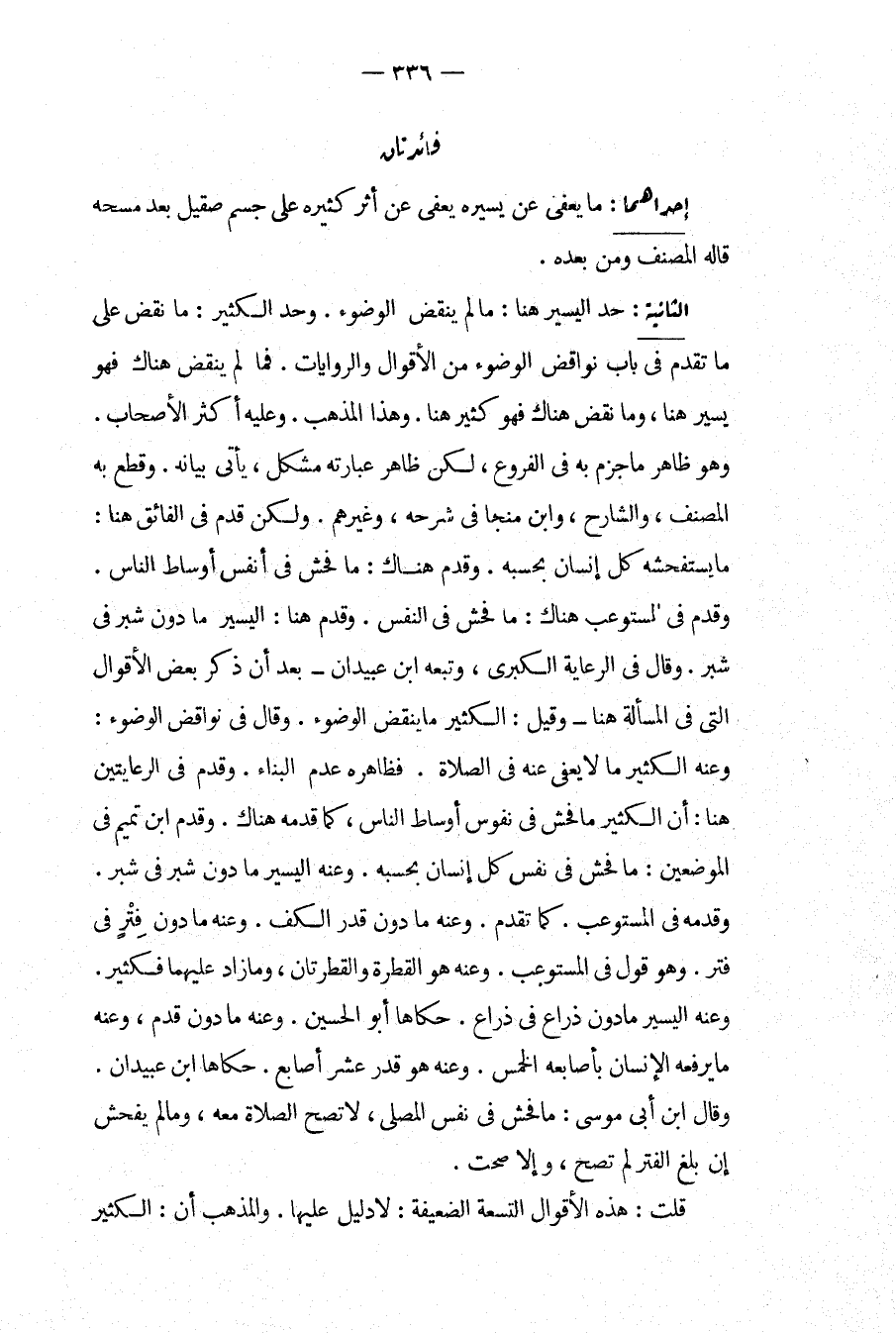 إحْدَاهُمَا: مَا يُعْفَى عَنْ يَسِيرِهِ يُعْفَى عَنْ أَثَرِ كَثِيرِهِ عَلَى جِسْمٍ صَقِيلٍ بَعْدَ مَسْحِهِ قَالَهُ الْمُصَنِّفُ وَمَنْ بَعْدَهُ. الثَّانِيَةُ: حَدُّ الْيَسِيرِ هُنَا: مَا لَمْ يُنْقِضْ الْوُضُوءَ. وَحَدُّ الْكَثِيرِ: مَا نَقَضَ عَلَى مَا تَقَدَّمَ فِي بَابِ نَوَاقِضِ الْوُضُوءِ مِنْ الْأَقْوَالِ وَالرِّوَايَاتِ. فَمَا لَمْ يُنْقِضْ هُنَاكَ فَهُوَ يَسِيرٌ هُنَا، وَمَا نَقَضَ هُنَاكَ فَهُوَ كَثِيرٌ هُنَا. وَهَذَا الْمَذْهَبُ. وَعَلَيْهِ أَكْثَرُ الْأَصْحَابِ، وَهُوَ ظَاهِرُ مَا جَزَمَ بِهِ فِي الْفُرُوعِ، لَكِنَّ ظَاهِرَ عِبَارَتِهِ مُشْكِلٌ، يَأْتِي بَيَانُهُ، وَقَطَعَ بِهِ الْمُصَنِّفُ، وَالشَّارِحُ، وَابْنُ مُنَجَّا فِي شَرْحِهِ، وَغَيْرِهِمْ. وَلَكِنْ قَدَّمَ فِي الْفَائِقِ هُنَا: مَا يَسْتَفْحِشُهُ كُلُّ إنْسَانٍ بِحَسَبِهِ. وَقَدَّمَ هُنَاكَ: مَا فَحُشَ فِي أَنْفُسِ أَوْسَاطِ النَّاسِ. وَقَدَّمَ فِي الْمُسْتَوْعِبِ هُنَاكَ: مَا فَحُشَ فِي النَّفْسِ. وَقَدَّمَ هُنَا: الْيَسِيرَ مَا دُونَ شِبْرٍ فِي شِبْرٍ. وَقَالَ فِي الرِّعَايَةِ الْكُبْرَى، وَتَبِعَهُ ابْنُ عُبَيْدَانِ بَعْدَ أَنْ ذَكَرَ بَعْضَ الْأَقْوَالِ الَّتِي فِي الْمَسْأَلَةِ هُنَا وَقِيلَ: الْكَثِيرُ مَا يُنْقِضُ الْوُضُوءَ. وَقَالَ فِي نَوَاقِضِ الْوُضُوءِ: وَعَنْهُ الْكَثِيرُ مَا لَا يُعْفَى عَنْهُ فِي الصَّلَاةِ. فَظَاهِرُهُ عَدَمُ الْبِنَاءِ. وَقَدَّمَ فِي الرِّعَايَتَيْنِ هُنَا: أَنَّ الْكَثِيرَ مَا فَحُشَ فِي نُفُوسِ أَوْسَاطِ النَّاسِ، كَمَا قَدَّمَهُ هُنَاكَ. وَقَدَّمَ ابْنُ تَمِيمٍ فِي الْمَوْضِعَيْنِ: مَا فَحُشَ فِي نَفْسِ كُلِّ إنْسَانٍ بِحَسَبِهِ. وَعَنْهُ الْيَسِيرُ مَا دُونَ شِبْرٍ فِي شِبْرٍ، وَقَدَّمَهُ فِي الْمُسْتَوْعِبِ كَمَا تَقَدَّمَ. وَعَنْهُ مَا دُونَ قَدْرِ الْكَفِّ. وَعَنْهُ مَا دُونَ فِثْرٍ فِي فِثْرٍ، وَهُوَ قَوْلٌ فِي الْمُسْتَوْعِبِ. وَعَنْهُ هُوَ الْقَطْرَةُ وَالْقَطْرَتَانِ، وَمَا زَادَ عَلَيْهِمَا فَكَثِيرٌ. وَعَنْهُ الْيَسِيرُ مَا دُونَ ذِرَاعٍ فِي ذِرَاعٍ. حَكَاهَا أَبُو الْحُسَيْنِ. وَعَنْهُ مَا دُونَ قَدَمٍ، وَعَنْهُ مَا يَرْفَعُهُ الْإِنْسَانُ بِأَصَابِعِهِ الْخَمْسِ. وَعَنْهُ هُوَ قَدْرُ عَشَرِ أَصَابِعَ. حَكَاهَا ابْنُ عُبَيْدَانِ. وَقَالَ ابْنُ أَبِي مُوسَى: مَا فَحُشَ فِي نَفْسِ الْمُصَلِّي، لَا تَصِحُّ الصَّلَاةُ مَعَهُ، وَمَا لَمْ يَفْحُشْ إنْ بَلَغَ الْفِتْرَ لَمْ تَصِحَّ، وَإِلَّا صَحَّتْ.