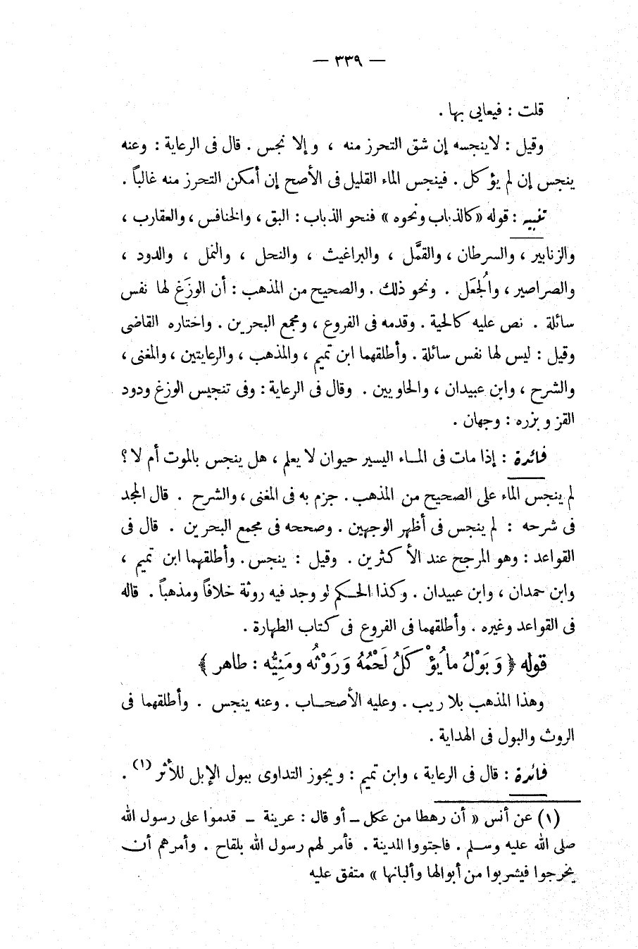 قَوْلُهُ (وَبَوْلُ مَا يُؤْكَلُ لَحْمُهُ وَرَوْثُهُ وَمَنِيُّهُ: طَاهِرٌ) وَهَذَا الْمَذْهَبُ بِلَا رَيْبٍ. وَعَلَيْهِ الْأَصْحَابُ. وَعَنْهُ يَنْجُسُ. وَأَطْلَقَهُمَا فِي الرَّوْثِ وَالْبَوْلِ فِي الْهِدَايَةِ.