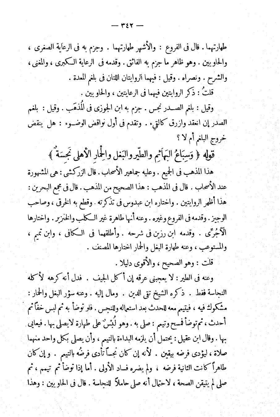 قَوْلُهُ (وَسِبَاعُ الْبَهَائِمِ وَالطَّيْرِ وَالْبَغْلِ وَالْحِمَارِ الْأَهْلِيِّ نَجِسَةٌ) هَذَا الْمَذْهَبُ فِي الْجَمِيعِ. وَعَلَيْهِ جَمَاهِيرُ الْأَصْحَابِ. قَالَ الزَّرْكَشِيُّ: هِيَ الْمَشْهُورَةُ عِنْدَ الْأَصْحَابِ. قَالَ فِي الْمُذْهَبِ: هَذَا الصَّحِيحُ مِنْ الْمَذْهَبِ، قَالَ فِي مَجْمَعِ الْبَحْرَيْنِ: هَذَا أَظْهَرُ الرِّوَايَتَيْنِ، وَاخْتَارَهُ ابْنُ عَبْدُوسٍ فِي تَذْكِرَتِهِ. وَقَطَعَ بِهِ الْخِرَقِيُّ، وَصَاحِبُ الْوَجِيزِ، وَقَدَّمَهُ فِي الْفُرُوعِ وَغَيْرِهِ. وَعَنْهُ أَنَّهَا طَاهِرَةٌ غَيْرُ الْكَلْبِ وَالْخِنْزِيرِ، وَاخْتَارَهَا الْآجُرِّيُّ. وَقَدَّمَهُ ابْنُ رَزِينٍ فِي شَرْحِهِ. وَأَطْلَقَهُمَا فِي الْكَافِي، وَابْنُ تَمِيمٍ، وَالْمُسْتَوْعِبِ، وَعَنْهُ طَهَارَةُ الْبَغْلِ وَالْحِمَارِ اخْتَارَهَا الْمُصَنِّفُ. قُلْت: وَهُوَ الصَّحِيحُ، وَالْأَقْوَى دَلِيلًا. وَعَنْهُ فِي الطَّيْرِ: لَا يُعْجِبُنِي عَرَقُهُ إنْ أَكَلَ الْجِيَفَ. فَدَلَّ أَنَّهُ كَرِهَهُ لِأَكْلِهِ النَّجَاسَةَ فَقَطْ. ذَكَرَهُ الشَّيْخُ تَقِيُّ الدِّينِ. وَمَالَ إلَيْهِ. وَعَنْهُ سُؤْرُ الْبَغْلِ وَالْحِمَارِ: مَشْكُوكٌ فِيهِ، فَيَتَيَمَّمُ مَعَهُ لِلْحَدَثِ بَعْدَ اسْتِعْمَالِهِ وَلِلنَّجِسِ. فَلَوْ تَوَضَّأَ بِهِ ثُمَّ لَبِسَ خُفًّا ثُمَّ أَحْدَثَ، ثُمَّ تَوَضَّأَ فَمَسَحَ وَتَيَمَّمَ: صَلَّى بِهِ، وَهُوَ لُبْسٌ عَلَى طَهَارَةٍ لَا يُصَلِّي بِهَا. فَيُعَايَى بِهَا. وَقَالَ ابْنُ عَقِيلٍ: يَحْتَمِلُ أَنْ يَلْزَمَهُ الْبُدَاءَةُ بِالتَّيَمُّمِ، وَأَنْ يُصَلِّيَ بِكُلِّ وَاحِدٍ مِنْهُمَا صَلَاةً، لِيُؤَدِّيَ فَرْضَهُ بِيَقِينٍ؛ لِأَنَّهُ إنْ كَانَ نَجِسًا تَأَدَّى فَرْضُهُ بِالتَّيَمُّمِ، وَإِنْ كَانَ طَاهِرًا كَانَتْ الثَّانِيَةُ فَرْضَهُ، وَلَمْ يَضُرَّهُ فَسَادُ الْأُولَى. أَمَّا إذَا تَوَضَّأَ ثُمَّ تَيَمَّمَ، ثُمَّ صَلَّى لَمْ يَتَيَقَّنْ الصِّحَّةَ، لِاحْتِمَالِ أَنَّهُ صَلَّى حَامِلًا لِلنَّجَاسَةِ. قَالَ فِي الْحَاوِيَيْنِ: وَهَذَا