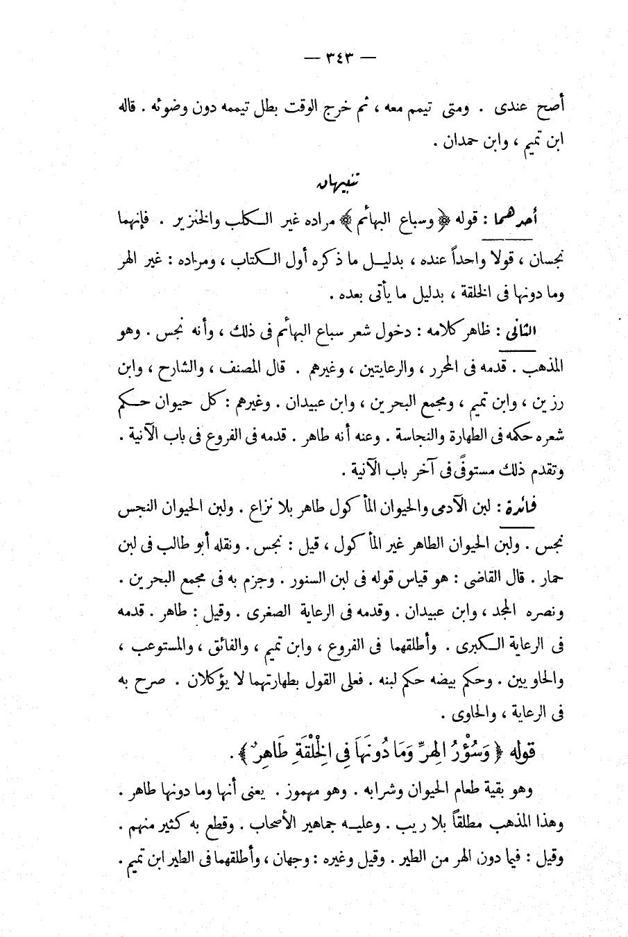 أَحَدَاهُمَا: قَوْلُهُ (وَسِبَاعُ الْبَهَائِمِ) مُرَادُهُ غَيْرُ الْكَلْبِ وَالْخِنْزِيرِ. فَإِنَّهُمَا نَجِسَانِ، قَوْلًا وَاحِدًا عِنْدَهُ، بِدَلِيلِ مَا ذَكَرَهُ أَوَّلَ الْكِتَابِ، وَمُرَادُهُ: غَيْرُ الْهِرِّ وَمَا دُونَهَا فِي الْخِلْقَةِ، بِدَلِيلِ مَا يَأْتِي بَعْدَهُ. الثَّانِي: ظَاهِرُ كَلَامِهِ: دُخُولُ شَعْرِ سِبَاعِ الْبَهَائِمِ فِي ذَلِكَ، وَأَنَّهُ نَجِسٌ، وَهُوَ الْمَذْهَبُ، قَدَّمَهُ فِي الْمُحَرَّرِ، وَالرِّعَايَتَيْنِ، وَغَيْرِهِمَا. قَالَ الْمُصَنِّفُ، وَالشَّارِحُ، وَابْنُ رَزِينٍ، وَابْنُ تَمِيمٍ، وَمَجْمَعُ الْبَحْرَيْنِ، وَابْنُ عُبَيْدَانَ. وَغَيْرُهُمْ: كُلُّ حَيَوَانٍ حُكْمُ شَعْرِهِ حُكْمُهُ فِي الطَّهَارَةِ وَالنَّجَاسَةِ. وَعَنْهُ أَنَّهُ طَاهِرٌ، قَدَّمَهُ فِي الْفُرُوعِ فِي بَابِ الْآنِيَةِ. وَتَقَدَّمَ ذَلِكَ مُسْتَوْفًى فِي آخِرِ بَابِ الْآنِيَةِ.