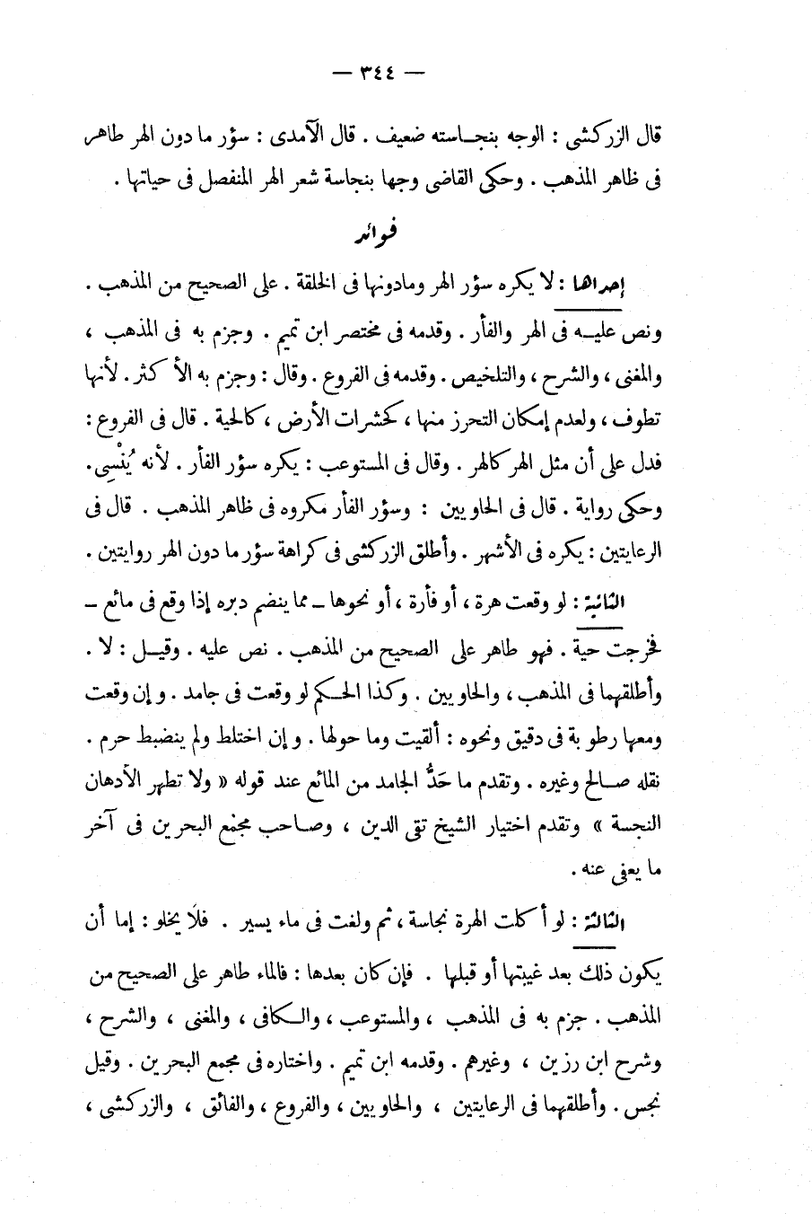 إحْدَاهُمَا: لَا يُكْرَهُ سُؤْرُ الْهِرِّ وَمَا دُونَهَا فِي الْخِلْقَةِ عَلَى الصَّحِيحِ مِنْ الْمَذْهَبِ، وَنَصَّ عَلَيْهِ فِي الْهِرِّ وَالْفَأْرِ، وَقَدَّمَهُ فِي مُخْتَصَرِ ابْنِ تَمِيمٍ، وَجَزَمَ بِهِ فِي الْمُذْهَبِ، وَالْمُغْنِي، وَالشَّرْحِ، وَالتَّلْخِيصِ، وَقَدَّمَهُ فِي الْفُرُوعِ. وَقَالَ: وَجَزَمَ بِهِ الْأَكْثَرُ؛ لِأَنَّهَا تَطُوفُ، وَلِعَدَمِ إمْكَانِ التَّحَرُّزِ مِنْهَا كَحَشَرَاتِ الْأَرْضِ، كَالْحَيَّةِ. قَالَ فِي الْفُرُوعِ: فَدَلَّ عَلَى أَنَّ مِثْلَ الْهِرِّ كَالْهِرِّ. وَقَالَ فِي الْمُسْتَوْعِبِ: يُكْرَهُ سُؤْرُ الْفَأْرِ؛ لِأَنَّهُ يُنْسِي. وَحَكَى رِوَايَةً، قَالَ فِي الْحَاوِيَيْنِ: وَسُؤْرُ الْفَأْرِ مَكْرُوهٌ فِي ظَاهِرِ الْمَذْهَبِ، قَالَ فِي الرِّعَايَتَيْنِ: يُكْرَهُ فِي الْأَشْهَرِ. وَأَطْلَقَ الزَّرْكَشِيُّ فِي كَرَاهَةِ سُؤْرِ مَا دُونَ الْهِرِّ رِوَايَتَيْنِ، الثَّانِيَةُ: لَوْ وَقَعَتْ هِرَّةٌ، أَوْ فَأْرَةٌ، أَوْ نَحْوُهَا مِمَّا يَنْضَمُّ دُبُرُهُ إذَا وَقَعَ فِي مَائِعٍ فَخَرَجَتْ حَيَّةً. فَهُوَ طَاهِرٌ عَلَى الصَّحِيحِ مِنْ الْمَذْهَبِ، نَصَّ عَلَيْهِ. وَقِيلَ: لَا. وَأَطْلَقَهُمَا فِي الْمُذْهَبِ، وَالْحَاوِيَيْنِ. وَكَذَا الْحُكْمُ لَوْ وَقَعَتْ فِي جَامِدٍ، وَإِنْ وَقَعَتْ وَمَعَهَا رُطُوبَةٌ فِي دَقِيقٍ وَنَحْوِهِ: أُلْقِيَتْ وَمَا حَوْلَهَا، وَإِنْ اخْتَلَطَ وَلَمْ يَنْضَبِطْ حَرُمَ. نَقَلَهُ صَالِحٌ وَغَيْرُهُ. وَتَقَدَّمَ مَا حَدُّ الْجَامِدِ مِنْ الْمَائِعِ عِنْدَ قَوْلِهِ " وَلَا تَطْهُرُ الْأَدْهَانُ النَّجِسَةُ " وَتَقَدَّمَ اخْتِيَارُ الشَّيْخِ تَقِيِّ الدِّينِ، وَصَاحِبِ مَجْمَعِ الْبَحْرَيْنِ فِي آخِرِ مَا يُعْفَى عَنْهُ. الثَّالِثَةُ: لَوْ أَكَلَتْ الْهِرَّةُ نَجَاسَةً، ثُمَّ وَلَغَتْ فِي مَاءٍ يَسِيرٍ. فَلَا يَخْلُو: إمَّا أَنْ يَكُونَ ذَلِكَ بَعْدَ غَيْبَتِهَا أَوْ قَبْلَهَا. فَإِنْ كَانَ بَعْدَهَا: فَالْمَاءُ طَاهِرٌ عَلَى الصَّحِيحِ مِنْ الْمَذْهَبِ، جَزَمَ بِهِ فِي الْمُذْهَبِ، وَالْمُسْتَوْعِبِ، وَالْكَافِي، وَالْمُغْنِي، وَالشَّرْحِ، وَشَرْحِ ابْنِ رَزِينٍ، وَغَيْرِهِمْ، وَقَدَّمَهُ ابْنُ تَمِيمٍ، وَاخْتَارَهُ فِي مَجْمَعِ الْبَحْرَيْنِ. وَقِيلَ نَجِسٌ. وَأَطْلَقَهُمَا فِي الرِّعَايَتَيْنِ، وَالْحَاوِيَيْنِ، وَالْفُرُوعِ، وَالْفَائِقِ، وَالزَّرْكَشِيُّ،