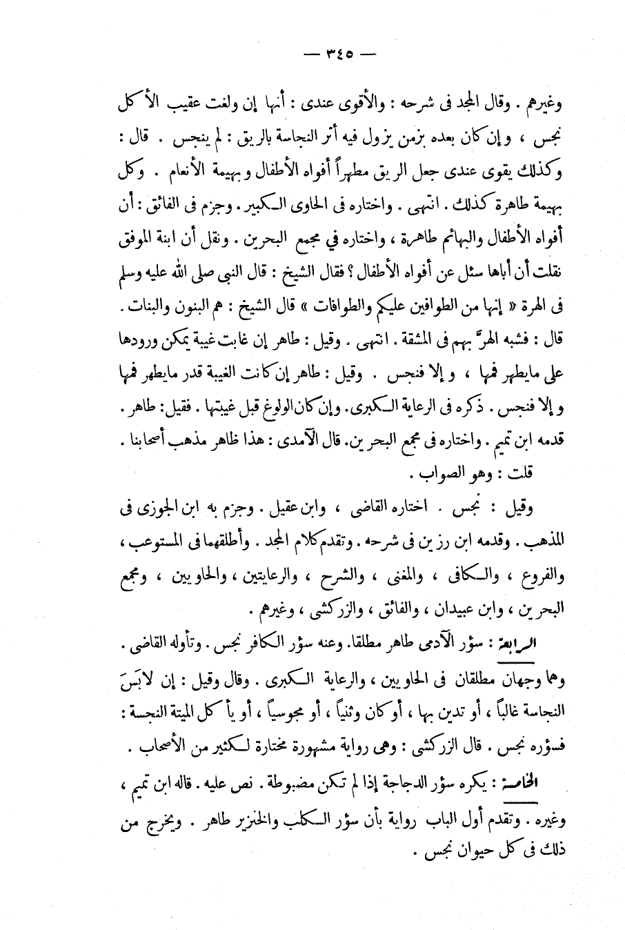 وَغَيْرِهِمْ. وَقَالَ الْمَجْدُ فِي شَرْحِهِ: وَالْأَقْوَى عِنْدِي: أَنَّهَا إنْ وَلَغَتْ عَقِيبَ الْأَكْلِ نَجِسٌ، وَإِنْ كَانَ بَعْدَهُ بِزَمَنٍ يَزُولُ فِيهِ أَثَرُ النَّجَاسَةِ بِالرِّيقِ: لَمْ يَنْجُسْ. قَالَ: وَكَذَلِكَ يَقْوَى عِنْدِي جَعْلُ الرِّيقِ مُطَهِّرًا أَفْوَاهَ الْأَطْفَالِ وَبَهِيمَةِ الْأَنْعَامِ. كُلِّ بَهِيمَةٍ طَاهِرَةٍ كَذَلِكَ. انْتَهَى، وَاخْتَارَهُ فِي الْحَاوِي الْكَبِيرِ، وَجَزَمَ فِي الْفَائِقِ: أَنَّ أَفْوَاهَ الْأَطْفَالِ وَالْبَهَائِمِ طَاهِرَةٌ، وَاخْتَارَهُ فِي مَجْمَعِ الْبَحْرَيْنِ. وَنَقَلَ أَنَّ ابْنَةَ الْمُوَفَّقِ نَقَلَتْ أَنَّ أَبَاهَا سُئِلَ عَنْ أَفْوَاهِ الْأَطْفَالِ؟ فَقَالَ الشَّيْخُ: قَالَ النَّبِيُّ - صَلَّى اللَّهُ عَلَيْهِ وَسَلَّمَ - فِي الْهِرَّةِ «إنَّهَا مِنْ الطَّوَّافِينَ عَلَيْكُمْ وَالطَّوَّافَاتِ» قَالَ الشَّيْخُ: هُمْ الْبَنُونَ وَالْبَنَاتُ. قَالَ: فَشَبَّهَ الْهِرَّ بِهِمْ فِي الْمَشَقَّةِ. انْتَهَى.