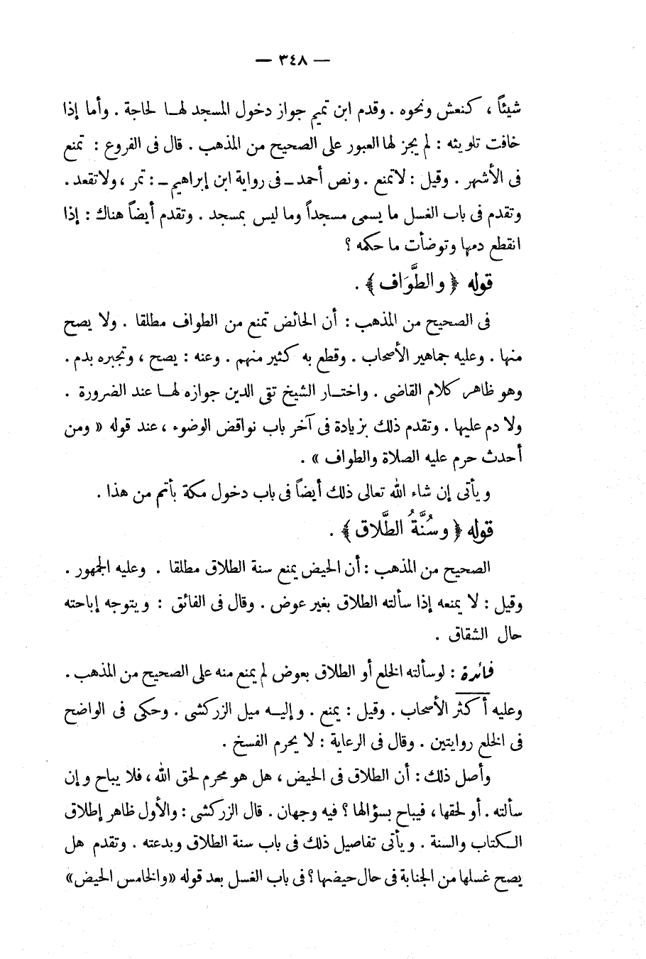 شَيْئًا، كَنَعْشٍ وَنَحْوِهِ. وَقَدَّمَ ابْنُ تَمِيمٍ جَوَازَ دُخُولِ الْمَسْجِدِ لَهَا لِحَاجَةٍ. وَأَمَّا إذَا خَافَتْ تَلْوِيثَهُ: لَمْ يَجُزْ لَهَا الْعُبُورُ عَلَى الصَّحِيحِ مِنْ الْمَذْهَبِ، قَالَ فِي الْفُرُوعِ: تُمْنَعُ فِي الْأَشْهَرِ. وَقِيلَ: لَا تُمْنَعُ. وَنَصَّ أَحْمَدُ فِي رِوَايَةِ ابْنِ إبْرَاهِيمَ: تَمُرُّ، وَلَا تَقْعُدُ وَتَقَدَّمَ فِي بَابِ الْغُسْلِ مَا يُسَمَّى مَسْجِدًا وَمَا لَيْسَ بِمَسْجِدٍ. وَتَقَدَّمَ أَيْضًا هُنَاكَ: إذَا انْقَطَعَ دَمُهَا وَتَوَضَّأَتْ مَا حُكْمُهُ؟ قَوْلُهُ (وَالطَّوَافُ) . فِي الصَّحِيحِ مِنْ الْمَذْهَبِ: أَنَّ الْحَائِضَ تُمْنَعُ مِنْ الطَّوَافِ مُطْلَقًا. وَلَا يَصِحُّ مِنْهَا. وَعَلَيْهِ جَمَاهِيرُ الْأَصْحَابِ، وَقَطَعَ بِهِ كَثِيرٌ مِنْهُمْ. وَعَنْهُ: يَصِحُّ، وَتَجْبُرُهُ بِدَمٍ، وَهُوَ ظَاهِرُ كَلَامِ الْقَاضِي. وَاخْتَارَ الشَّيْخُ تَقِيُّ الدِّينِ جَوَازَهُ لَهَا عِنْدَ الضَّرُورَةِ. وَلَا دَمَ عَلَيْهَا وَتَقَدَّمَ ذَلِكَ بِزِيَادَةٍ فِي آخِرِ بَابِ نَوَاقِضِ الْوُضُوءِ، عِنْدَ قَوْلِهِ " وَمَنْ أَحْدَثَ حَرُمَ عَلَيْهِ الصَّلَاةُ وَالطَّوَافُ " وَيَأْتِي إنْ شَاءَ اللَّهُ تَعَالَى ذَلِكَ أَيْضًا فِي بَابِ دُخُولِ مَكَّةَ بِأَتَمَّ مِنْ هَذَا. قَوْلُهُ (وَسُنَّةُ الطَّلَاقِ) ، الصَّحِيحُ مِنْ الْمَذْهَبِ: أَنَّ الْحَيْضَ يَمْنَعُ سُنَّةَ الطَّلَاقِ مُطْلَقًا. وَعَلَيْهِ الْجُمْهُورُ. وَقِيلَ: لَا يَمْنَعُهُ إذَا سَأَلَتْهُ الطَّلَاقَ بِغَيْرِ عِوَضٍ. وَقَالَ فِي الْفَائِقِ: وَيَتَوَجَّهُ إبَاحَتُهُ حَالَ الشِّقَاقِ.