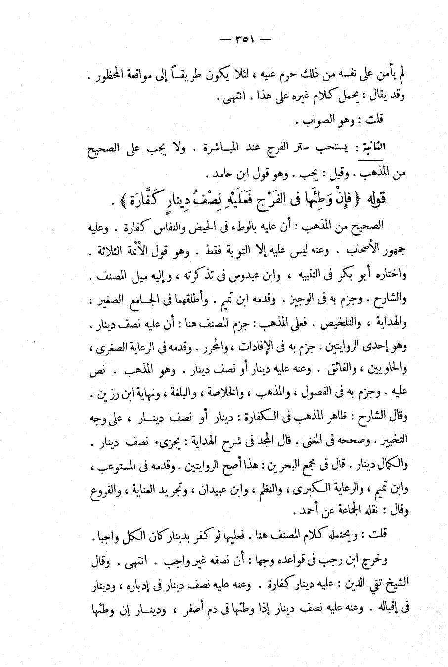 قَوْلُهُ (فَإِنْ وَطِئَهَا فِي الْفَرْجِ فَعَلَيْهِ نِصْفُ دِينَارٍ كَفَّارَةً) ، الصَّحِيحُ مِنْ الْمَذْهَبِ: أَنَّ عَلَيْهِ بِالْوَطْءِ فِي الْحَيْضِ وَالنِّفَاسِ كَفَّارَةً. وَعَلَيْهِ جُمْهُورُ الْأَصْحَابِ. وَعَنْهُ لَيْسَ عَلَيْهِ إلَّا التَّوْبَةُ فَقَطْ، وَهُوَ قَوْلُ الْأَئِمَّةِ الثَّلَاثَةِ، وَاخْتَارَهُ أَبُو بَكْرٍ فِي التَّنْبِيهِ، وَابْنُ عَبْدُوسٍ فِي تَذْكِرَتِهِ، وَإِلَيْهِ مَيْلُ الْمُصَنِّفِ. وَالشَّارِحِ، وَجَزَمَ بِهِ فِي الْوَجِيزِ، وَقَدَّمَهُ ابْنُ تَمِيمٍ. وَأَطْلَقَهُمَا فِي الْجَامِعِ الصَّغِيرِ، وَالْهِدَايَةِ، وَالتَّلْخِيصِ. فَعَلَى الْمَذْهَبِ: جَزَمَ الْمُصَنِّفُ هُنَا: أَنَّ عَلَيْهِ نِصْفَ دِينَارٍ، وَهُوَ إحْدَى الرِّوَايَتَيْنِ، جَزَمَ بِهِ فِي الْإِفَادَاتِ، وَالْمُحَرَّرِ. وَقَدَّمَهُ فِي الرِّعَايَةِ الصُّغْرَى، وَالْحَاوِيَيْنِ، وَالْفَائِقِ. وَعَنْهُ عَلَيْهِ دِينَارٌ أَوْ نِصْفُ دِينَارٍ، وَهُوَ الْمَذْهَبُ، نَصَّ عَلَيْهِ، وَجَزَمَ بِهِ فِي الْفُصُولِ، وَالْمُذْهَبِ، وَالْخُلَاصَةِ، وَالْبُلْغَةِ، وَنِهَايَةِ ابْنِ رَزِينٍ. وَقَالَ الشَّارِحُ: ظَاهِرُ الْمَذْهَبِ فِي الْكَفَّارَةِ: دِينَارٌ أَوْ نِصْفُ دِينَارٍ، عَلَى وَجْهِ التَّخْيِيرِ. وَصَحَّحَهُ فِي الْمُغْنِي. قَالَ الْمَجْدُ فِي شَرْحِ الْهِدَايَةِ: يُجْزِئُ نِصْفُ دِينَارٍ. وَالْكَمَالُ دِينَارٌ. قَالَ فِي مَجْمَعِ الْبَحْرَيْنِ: هَذَا أَصَحُّ الرِّوَايَتَيْنِ، وَقَدَّمَهُ فِي الْمُسْتَوْعِبِ، وَابْنُ تَمِيمٍ، وَالرِّعَايَةِ الْكُبْرَى وَالنَّظْمِ، وَابْنُ عُبَيْدَانِ، وَتَجْرِيدِ الْعِنَايَةِ. وَالْفُرُوعِ وَقَالَ: نَقَلَهُ الْجَمَاعَةُ عَنْ أَحْمَدَ. قُلْت: وَيَحْتَمِلُهُ كَلَامُ الْمُصَنِّفِ هُنَا. فَعَلَيْهَا لَوْ كَفَّرَ بِدِينَارٍ كَانَ الْكُلُّ وَاجِبًا. وَخَرَّجَ ابْنُ رَجَبٍ فِي قَوَاعِدِهِ وَجْهًا: أَنَّ نِصْفَهُ غَيْرُ وَاجِبٍ. انْتَهَى.