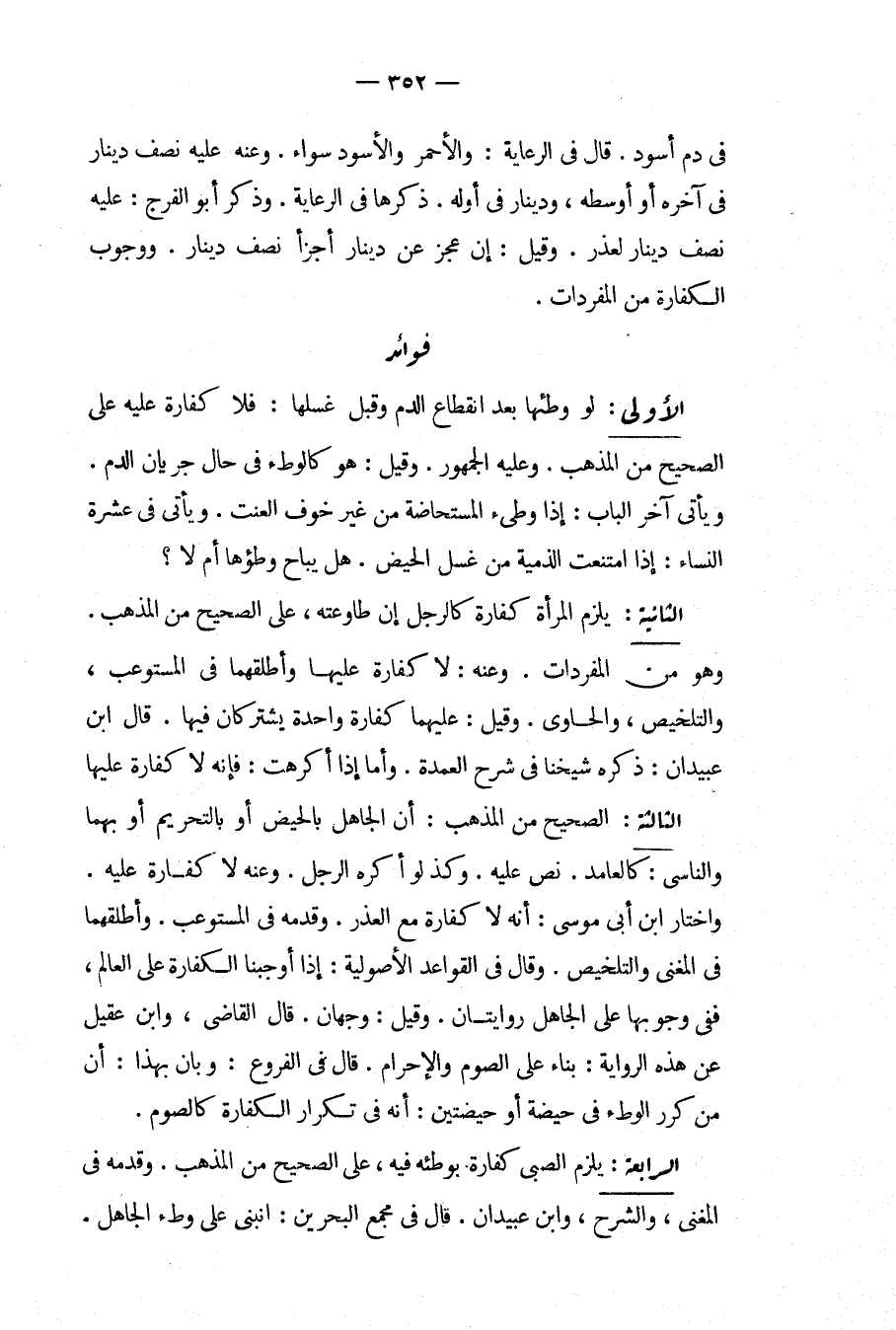 الْأُولَى: لَوْ وَطِئَهَا بَعْدَ انْقِطَاعِ الدَّمِ وَقَبْلَ غُسْلِهَا: فَلَا كَفَّارَةَ عَلَيْهِ عَلَى الصَّحِيحِ مِنْ الْمَذْهَبِ. وَعَلَيْهِ الْجُمْهُورُ. وَقِيلَ: هُوَ كَالْوَطْءِ فِي حَالِ جَرَيَانِ الدَّمِ. وَيَأْتِي آخِرَ الْبَابِ: إذَا وَطِئَ الْمُسْتَحَاضَةَ مِنْ غَيْرِ خَوْفِ الْعَنَتِ وَيَأْتِي فِي عِشْرَةِ النِّسَاءِ: إذَا امْتَنَعَتْ الذِّمِّيَّةُ مِنْ غُسْلِ الْحَيْضِ. هَلْ يُبَاحُ وَطْؤُهَا أَمْ لَا؟ الثَّانِيَةُ: يَلْزَمُ الْمَرْأَةَ كَفَّارَةٌ كَالرَّجُلِ إنْ طَاوَعَتْهُ، عَلَى الصَّحِيحِ مِنْ الْمَذْهَبِ، وَهُوَ مِنْ الْمُفْرَدَاتِ. وَعَنْهُ: لَا كَفَّارَةَ عَلَيْهِمَا وَأَطْلَقَهُمَا فِي الْمُسْتَوْعِبِ، وَالتَّلْخِيصِ، وَالْحَاوِي. وَقِيلَ: عَلَيْهِمَا كَفَّارَةٌ وَاحِدَةٌ يَشْتَرِكَانِ فِيهَا. قَالَ ابْنُ عُبَيْدَانِ: ذَكَرَهُ شَيْخُنَا فِي شَرْحِ الْعُمْدَةِ. وَأَمَّا إذَا أُكْرِهَتْ: فَإِنَّهُ لَا كَفَّارَةَ عَلَيْهَا الثَّالِثَةُ: الصَّحِيحُ مِنْ الْمَذْهَبِ: أَنَّ الْجَاهِلَ بِالْحَيْضِ أَوْ بِالتَّحْرِيمِ أَوْ بِهِمَا وَالنَّاسِي كَالْعَامِدِ، نَصَّ عَلَيْهِ. وَكَذَا لَوْ أُكْرِهَ الرَّجُلُ. وَعَنْهُ لَا كَفَّارَةَ عَلَيْهِ. وَاخْتَارَ ابْنُ أَبِي مُوسَى: أَنَّهُ لَا كَفَّارَةَ مَعَ الْعُذْرِ، وَقَدَّمَهُ فِي الْمُسْتَوْعِبِ. وَأَطْلَقَهُمَا فِي الْمُغْنِي وَالتَّلْخِيصِ. وَقَالَ فِي الْقَوَاعِدِ الْأُصُولِيَّةِ: إذَا أَوْجَبْنَا الْكَفَّارَةَ عَلَى الْعَالِمِ، فَفِي وُجُوبِهَا عَلَى الْجَاهِلِ رِوَايَتَانِ. وَقِيلَ: وَجْهَانِ، قَالَ الْقَاضِي، وَابْنُ عَقِيلٍ عَنْ هَذِهِ الرِّوَايَةِ: بِنَاءً عَلَى الصَّوْمِ وَالْإِحْرَامِ. قَالَ فِي الْفُرُوعِ: وَبَانَ بِهَذَا: أَنَّ مَنْ كَرَّرَ الْوَطْءَ فِي حَيْضَةٍ أَوْ حَيْضَتَيْنِ: أَنَّهُ فِي تَكْرَارِ الْكَفَّارَةِ كَالصَّوْمِ. الرَّابِعَةُ: يَلْزَمُ الصَّبِيَّ كَفَّارَةٌ بِوَطْئِهِ فِيهِ، عَلَى الصَّحِيحِ مِنْ الْمَذْهَبِ، وَقَدَّمَهُ فِي الْمُغْنِي، وَالشَّرْحِ، وَابْنُ عُبَيْدَانِ. قَالَ فِي مَجْمَعِ الْبَحْرَيْنِ: انْبَنَى عَلَى وَطْءِ الْجَاهِلِ.