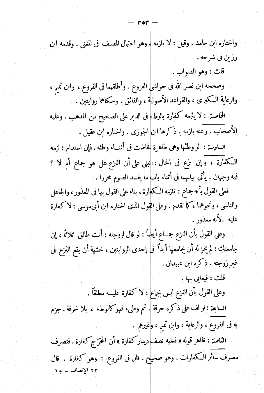 وَاخْتَارَهُ ابْنُ حَامِدٍ. وَقِيلَ: لَا يَلْزَمُهُ، وَهُوَ احْتِمَالُ الْمُصَنِّفِ فِي الْمُغْنِي، وَقَدَّمَهُ ابْنُ رَزِينٍ فِي شَرْحِهِ. قُلْت: وَهُوَ الصَّوَابُ. وَصَحَّحَهُ ابْنُ نَصْرِ اللَّهِ فِي حَوَاشِي الْفُرُوعِ. وَأَطْلَقَهُمَا فِي الْفُرُوعِ، وَابْنُ تَمِيمٍ، وَالرِّعَايَةِ الْكُبْرَى، وَالْقَوَاعِدِ الْأُصُولِيَّةِ، وَالْفَائِقِ. وَحَكَاهُمَا رِوَايَتَيْنِ، الْخَامِسَةُ: لَا يَلْزَمُهُ كَفَّارَةٌ بِالْوَطْءِ فِي الدُّبُرِ عَلَى الصَّحِيحِ مِنْ الْمَذْهَبِ. وَعَلَيْهِ الْأَصْحَابُ. وَعَنْهُ يَلْزَمُهُ. ذَكَرَهَا ابْنُ الْجَوْزِيِّ، وَاخْتَارَهُ ابْنُ عَقِيلٍ.