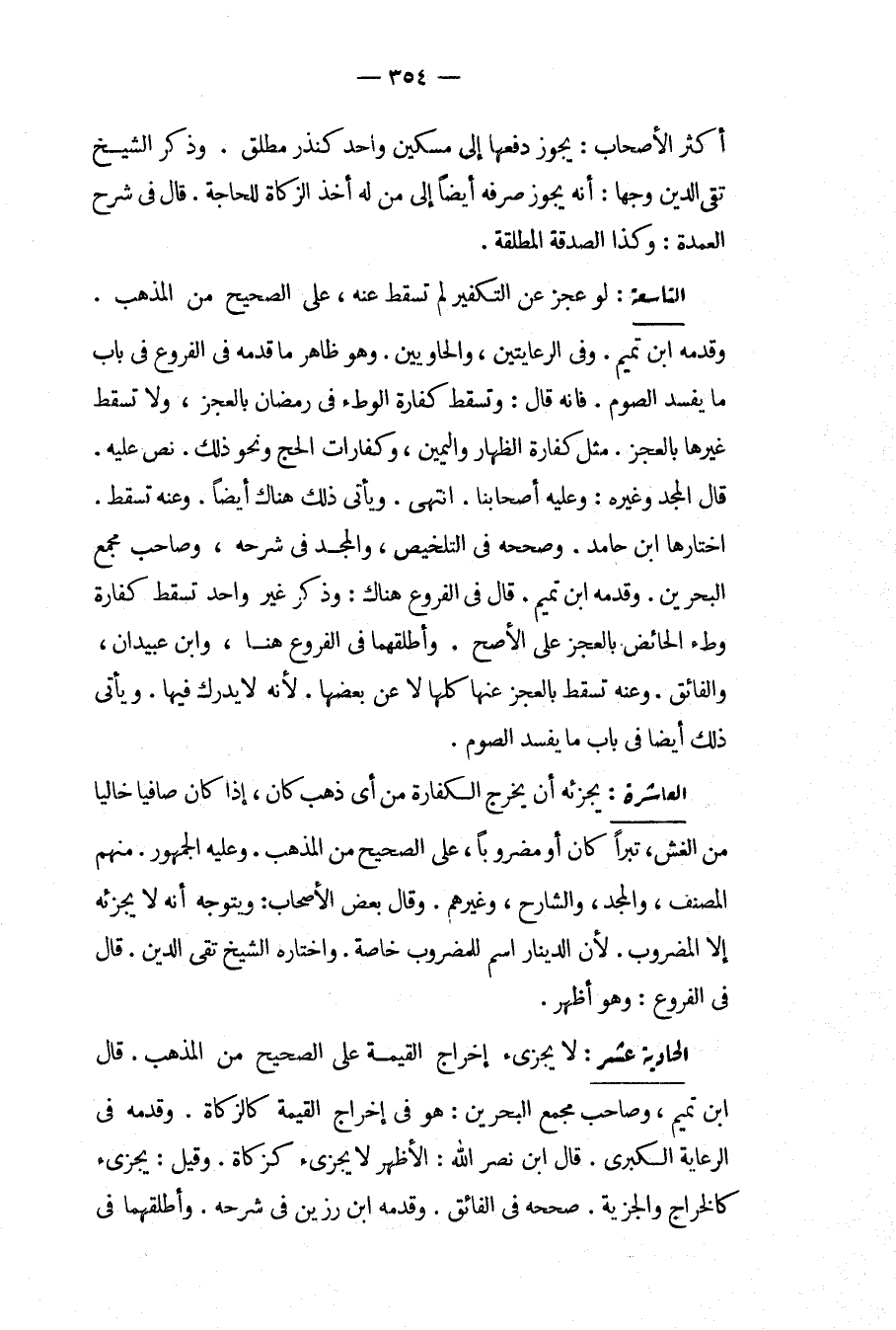 أَكْثَرُ الْأَصْحَابِ: يَجُوزُ دَفْعُهَا إلَى مِسْكِينٍ وَاحِدٍ كَنَذْرٍ مُطْلَقٍ. وَذَكَرَ الشَّيْخُ تَقِيُّ الدِّينِ وَجْهًا: أَنَّهُ يَجُوزُ صَرْفُهُ أَيْضًا إلَى مَنْ لَهُ أَخْذُ الزَّكَاةِ لِلْحَاجَةِ. قَالَ فِي شَرْحِ الْعُمْدَةِ: وَكَذَا الصَّدَقَةُ الْمُطْلَقَةُ. التَّاسِعَةُ: لَوْ عَجَزَ عَنْ التَّكْفِيرِ لَمْ تَسْقُطْ عَنْهُ، عَلَى الصَّحِيحِ مِنْ الْمَذْهَبِ، وَقَدَّمَهُ ابْنُ تَمِيمٍ. وَفِي الرِّعَايَتَيْنِ، وَالْحَاوِيَيْنِ، وَهُوَ ظَاهِرُ مَا قَدَّمَهُ فِي الْفُرُوعِ فِي بَابِ مَا يُفْسِدُ الصَّوْمَ. فَإِنَّهُ قَالَ: وَتَسْقُطُ كَفَّارَةُ الْوَطْءِ فِي رَمَضَانَ بِالْعَجْزِ، وَلَا تَسْقُطُ غَيْرُهَا بِالْعَجْزِ. مِثْلُ كَفَّارَةِ الظِّهَارِ وَالْيَمِينِ، وَكَفَّارَاتِ الْحَجِّ وَنَحْوِ ذَلِكَ، نَصَّ عَلَيْهِ، قَالَ الْمَجْدُ وَغَيْرُهُ: وَعَلَيْهِ أَصْحَابُنَا. انْتَهَى.